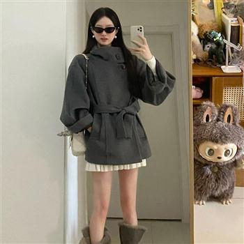 YF6851-图片色小香风秋冬加厚毛呢撞色拼接设计长袖立领排扣短装外套