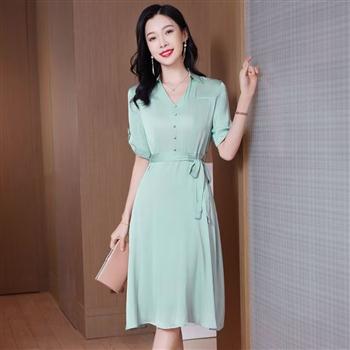 YF7162-(2色入内)新款名媛气质短袖V领收腰仿真丝柔软亲肤高级感夏季连衣裙
