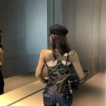YF7163-(2色入内)假两件后背缕空迷彩拼接长袖套头设计上衣弹力修身显瘦工字背心