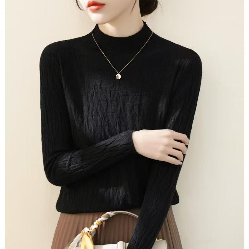 YF4225-(8色入内)时尚褶折暗纹圆领长袖纯色简约肌理内搭针织上衣