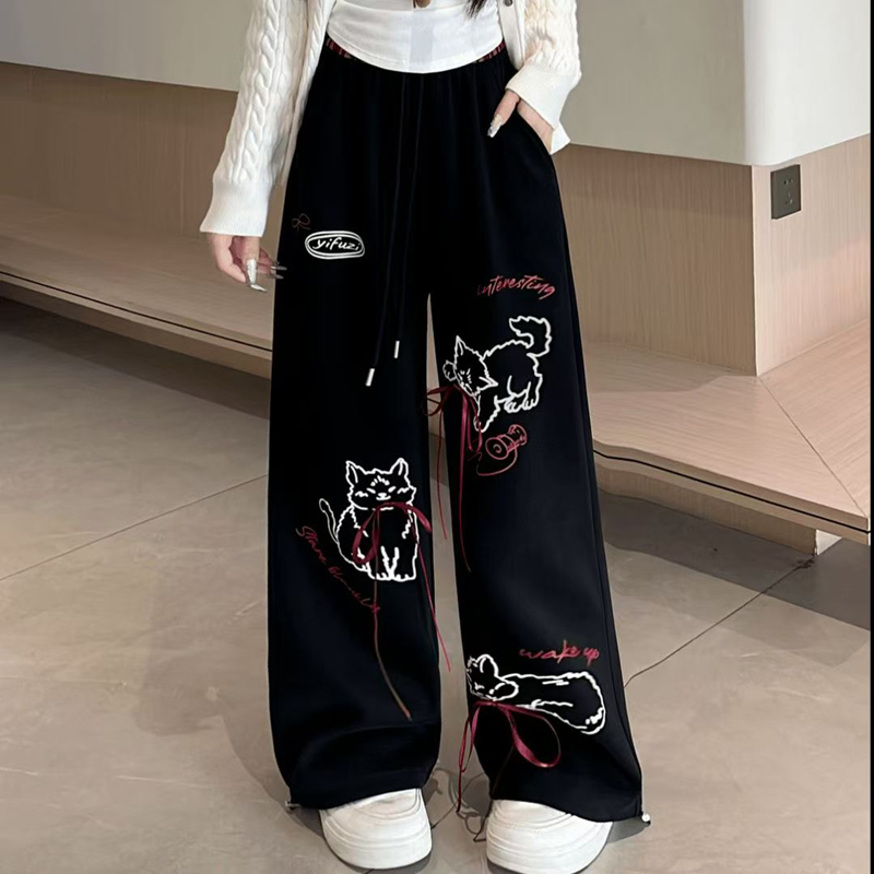 YF4270-(2色入内)港味小可爱系丝带猫咪松紧腰直筒坠地感慵懒风大码卫衣裤