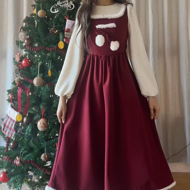 YF4272-图片色节日喜庆红色拉接假两件长袖套头修腰中长款过膝连衣裙