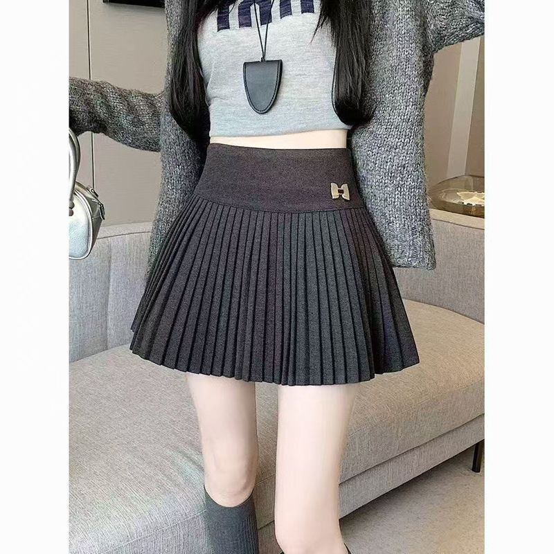 YF4315-(4色入内)秋冬小可爱蝴蝶结高腰百褶裙 纯色A字毛呢保暖防走光短裙