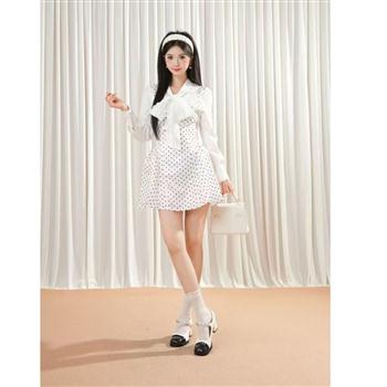 YF6174-图片色甜美时尚蝴蝶结雪纺拼接波点修身长袖优雅气质雪纺裙