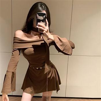 YF6176-(3色入内)辣妹新款一字肩围脖系领带喇叭袖收腰显瘦秋冬连衣裙