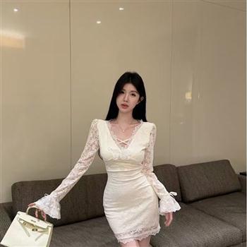 YF6260-图片色优雅春秋新款喇叭袖交叉领蝴蝶结设计弹力修腰包臀蕾丝连衣裙