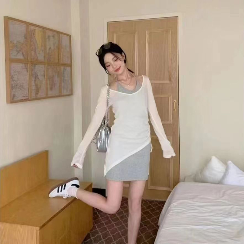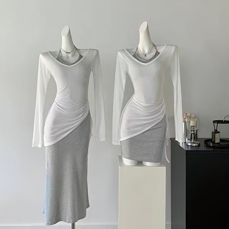 YF4427-图片色时尚春装圆领长袖套头不规则抽绳褶折开薄款白色上衣