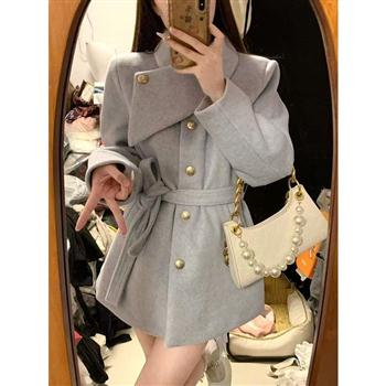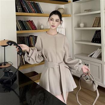 YF6191-(3色入内)冬季泡泡袖立领系腰带宽松显瘦加厚毛呢时尚设计外套