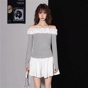 YF6195-图片色一字肩碎花设计长袖修腰拼接洋气纯欲女辣妹新款春秋上衣