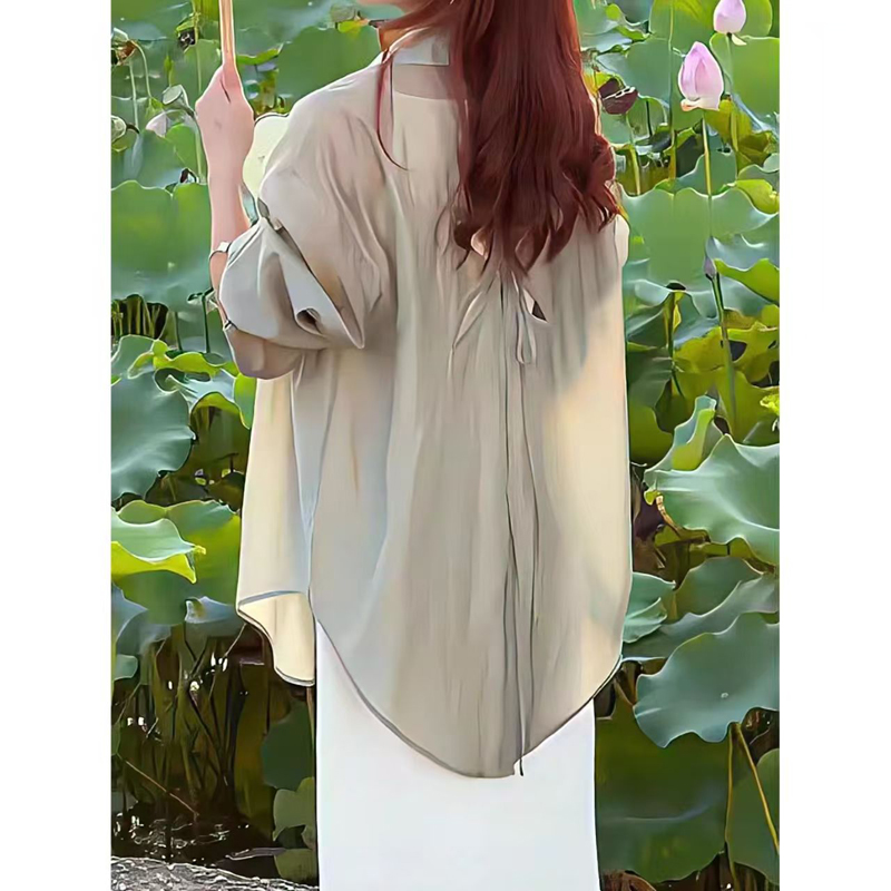 YF4581-(4色入内)时尚飘带后背蝴蝶镂空设计开叉大码洋气雪纺衫 薄款夏季上衣