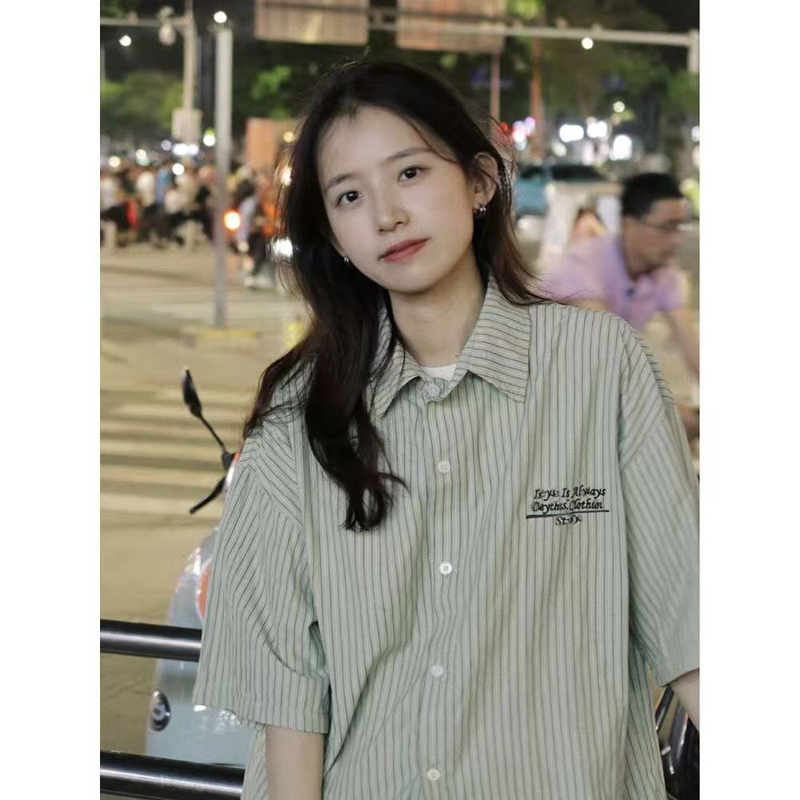 YF4616-(2色入内)港味夏季新款字母刺绣口袋条纹显瘦大码慵懒风上衣