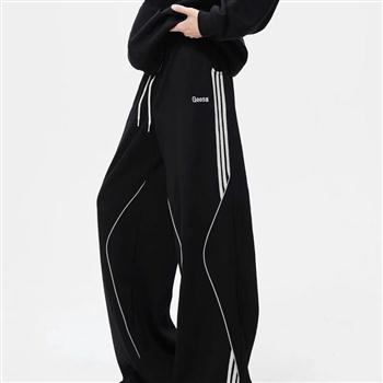 YF6644-图片色港式不规则条纹设计松紧腰绑绳直筒坠地感嘻哈风运动休闲裤