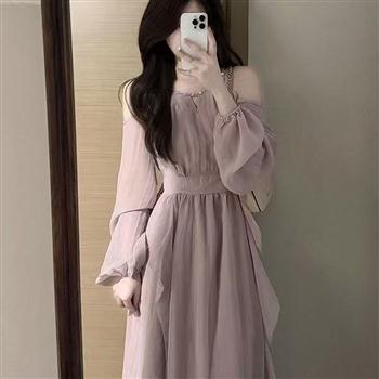 YF6647-图片色甜美时尚泡泡袖镂空套头飘带系腰褶折荷叶边设计小别致雪纺连衣裙