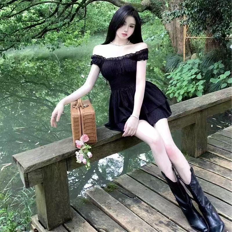 YF4818-图片色夏季一字肩荷叶边修腰拼接蓬蓬裙 赫本风蕾丝短裙子