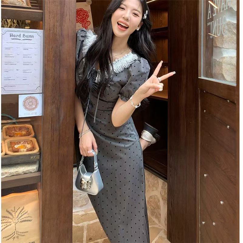 YF4865-图片色优雅泡泡袖蕾丝边撞色公主领褶折抹胸修腰波点长裙