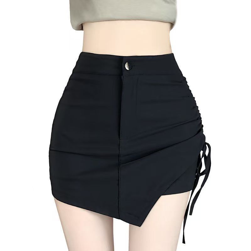 YF5589-图片色黑色百搭高腰不规则菱型侧抽绳包臀辣妹夏季短裙