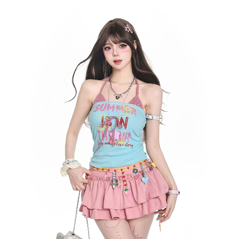 YF5830-(2色入内)性感时尚吊带格子拼接字母印花假两件辣妹上衣