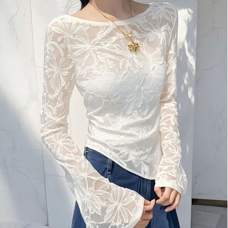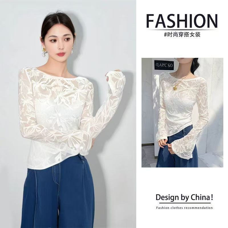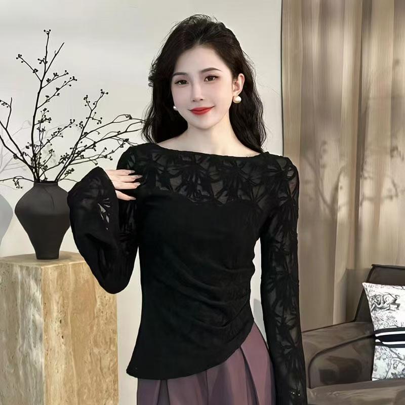 YF5843-(3色入内)韩版喇叭袖套头不规则花朵提花弹力修身显瘦蕾丝上衣