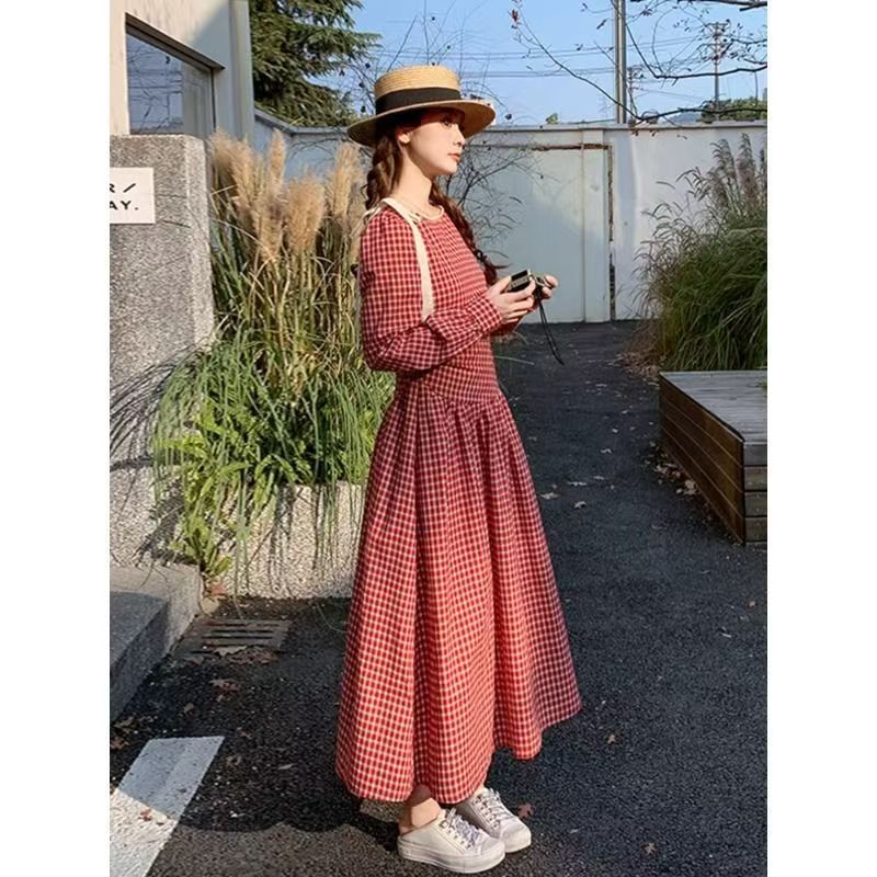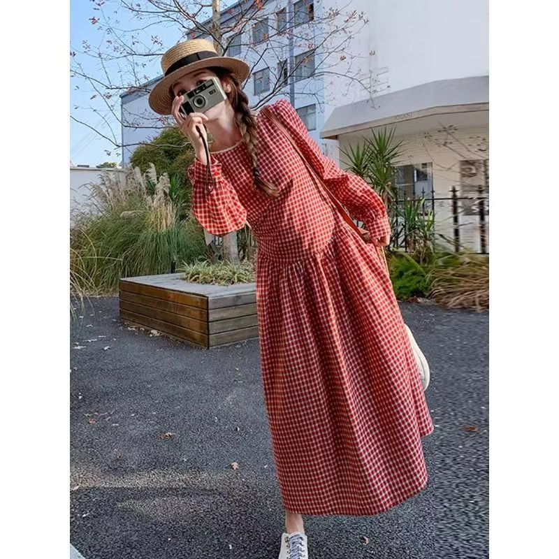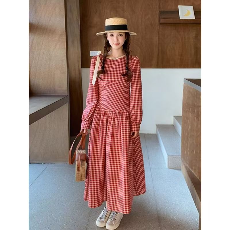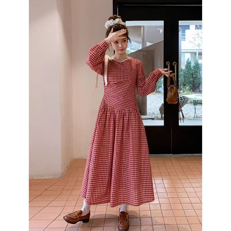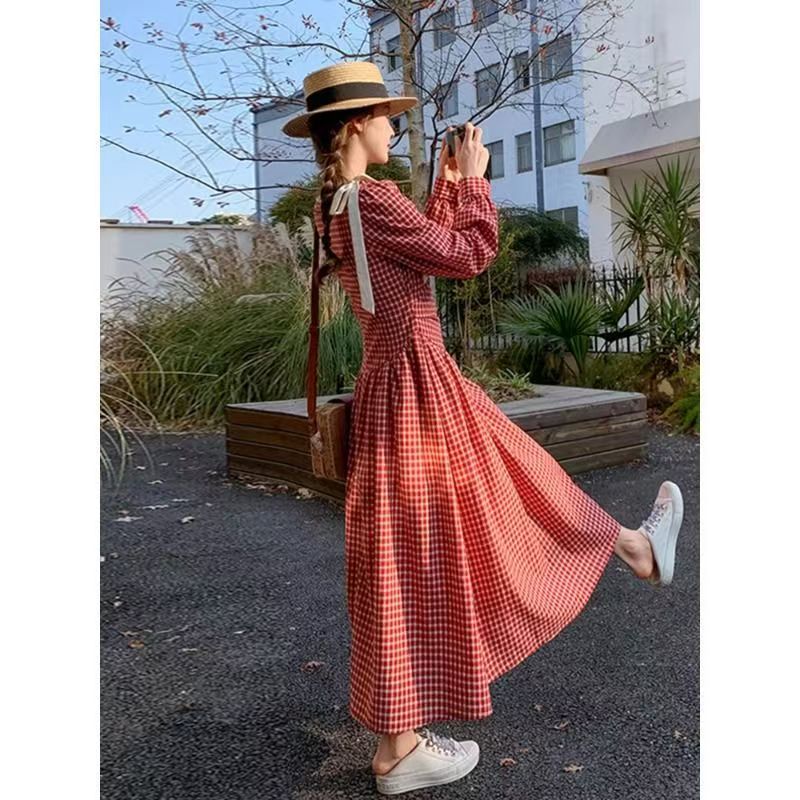 YF5844-图片色甜美小可爱泡泡袖系蝴蝶结红色格子宽松显瘦拼接春秋连衣裙