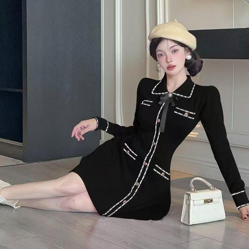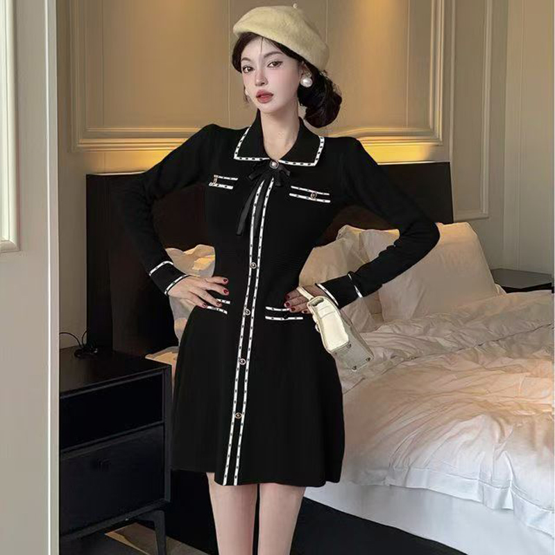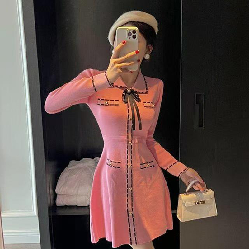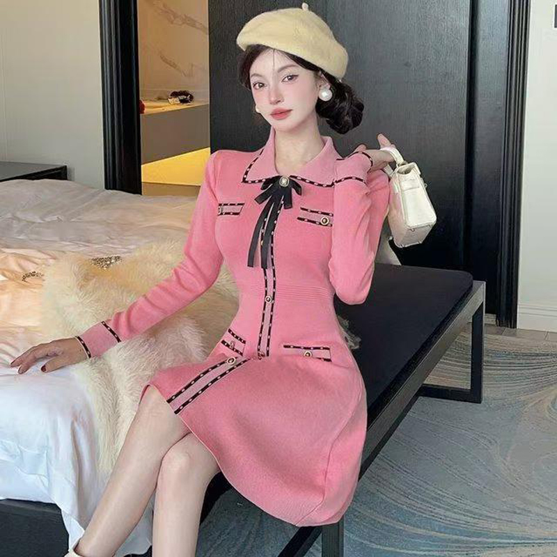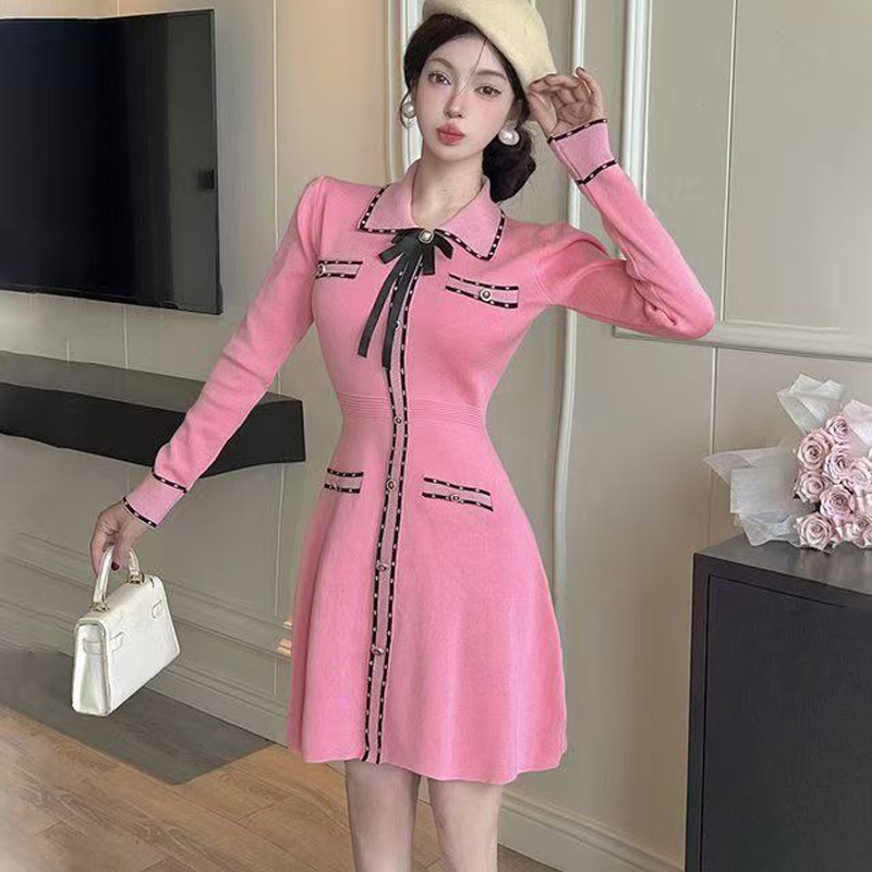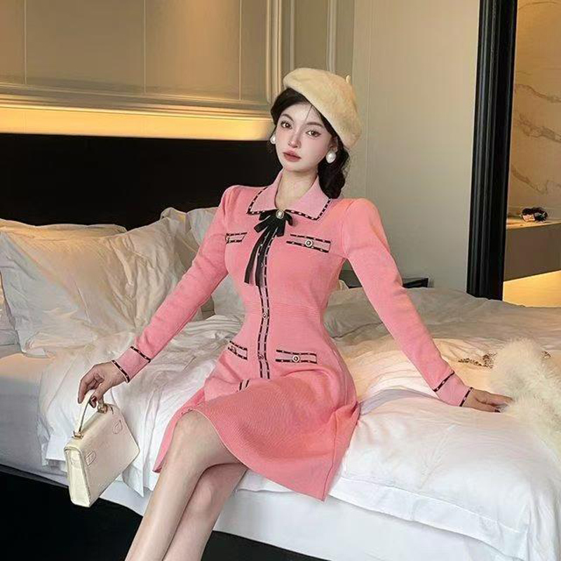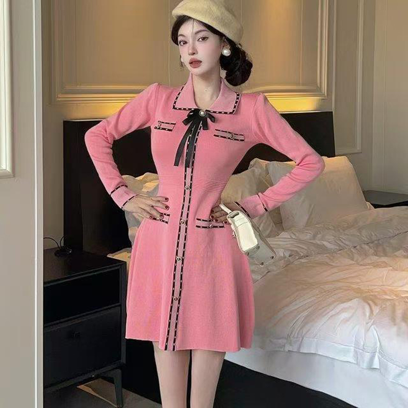 YF5990-(3色入内)韩版冬季新款长袖翻领系蝴蝶结收腰撞色针织连衣裙