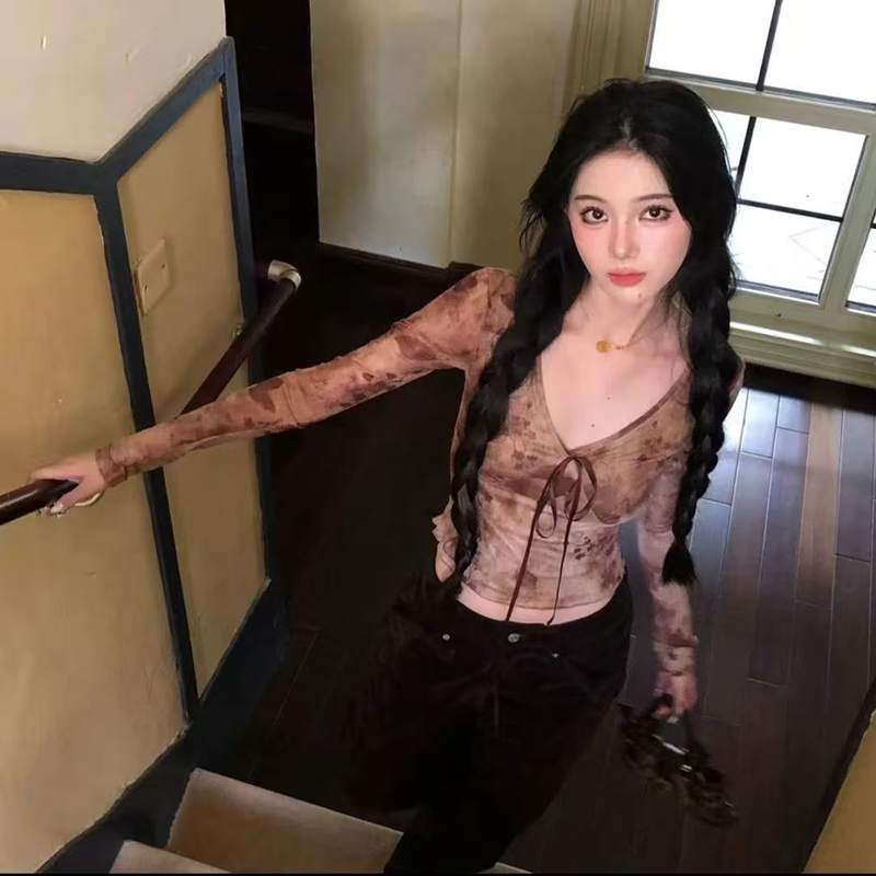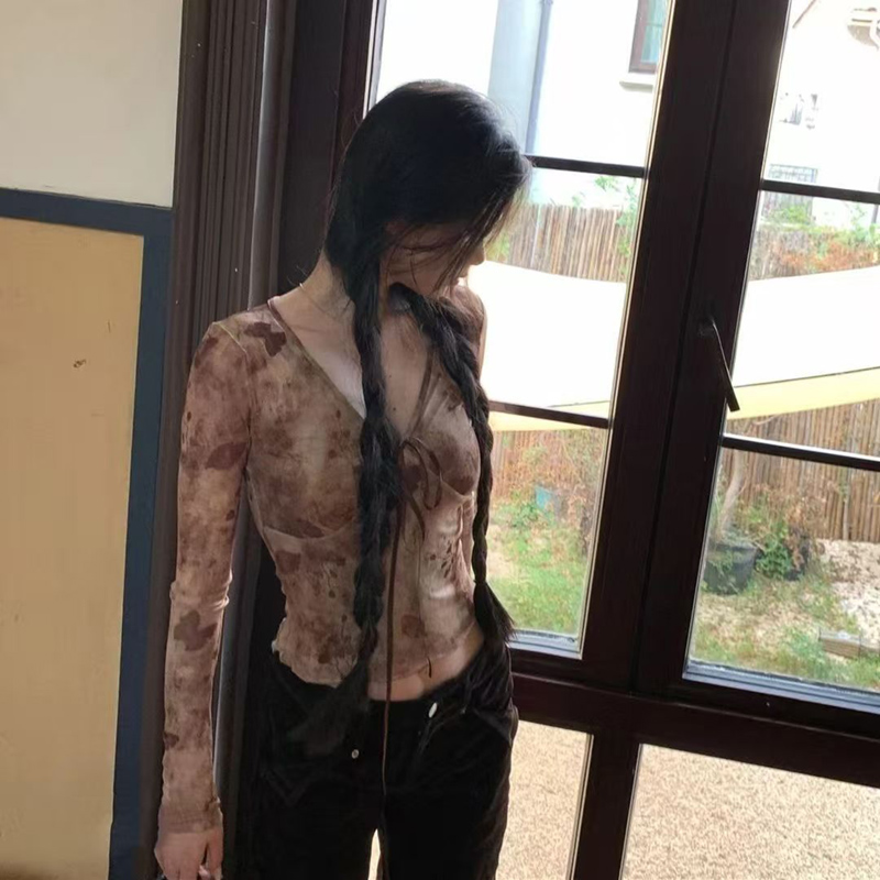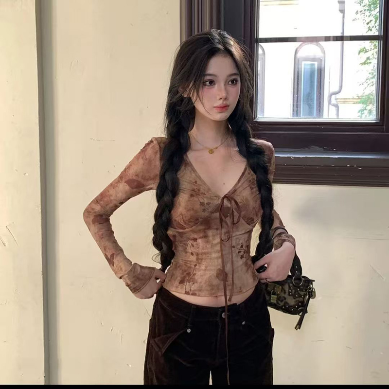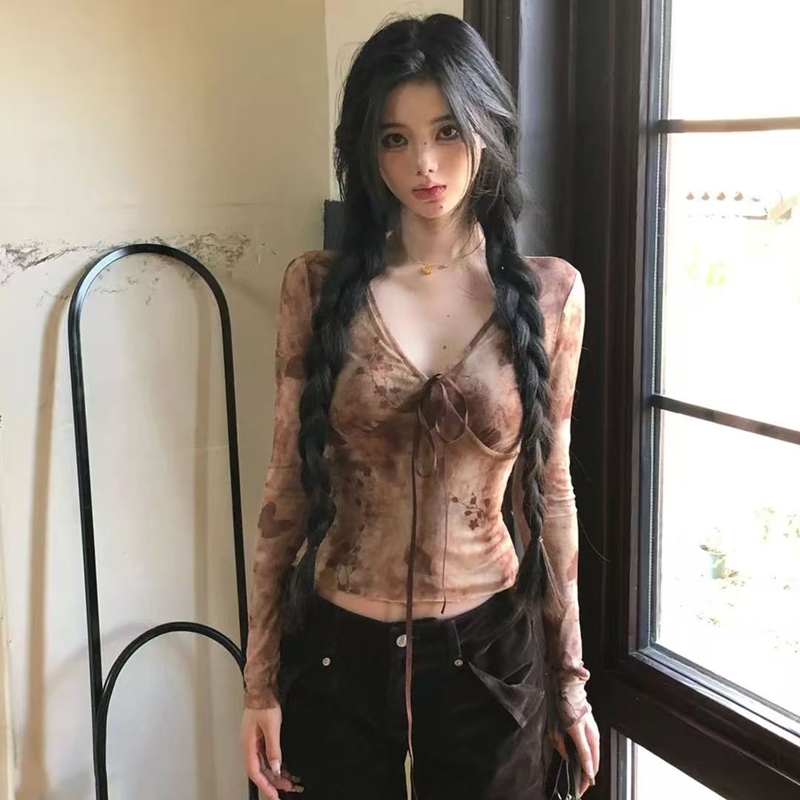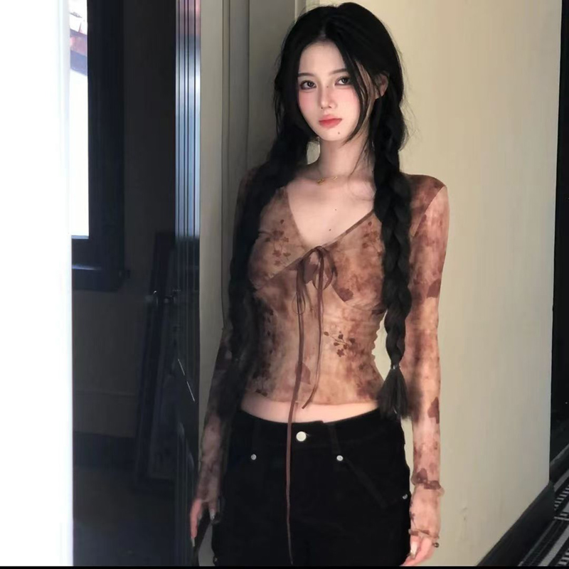 YF5996-图片色春秋蕾丝长袖V领系蝴蝶结扎染弹力收腰碎花网纱上衣