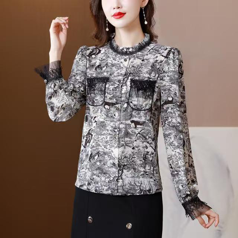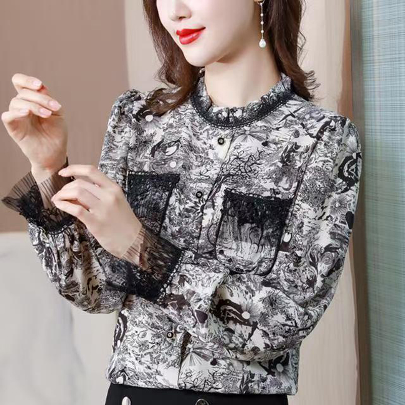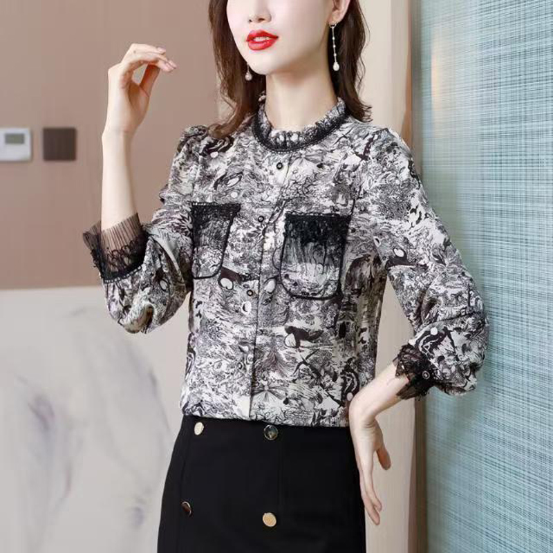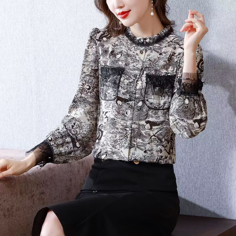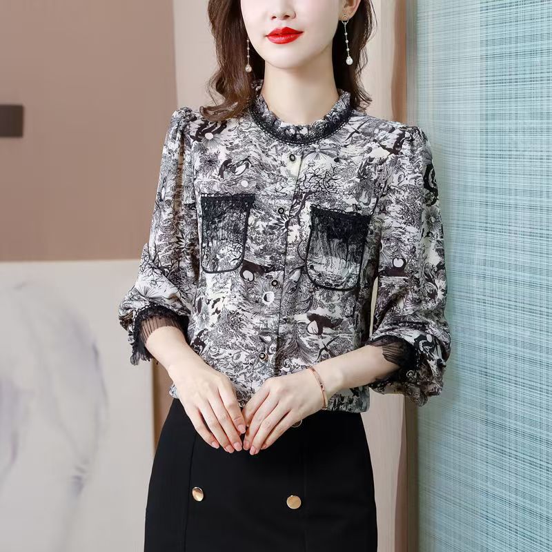 YF5997-图片色时尚高端长袖蕾丝边立领排扣碎花个性宽松大码春秋新款雪纺衫