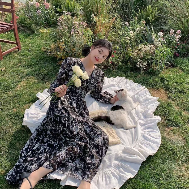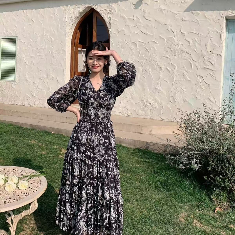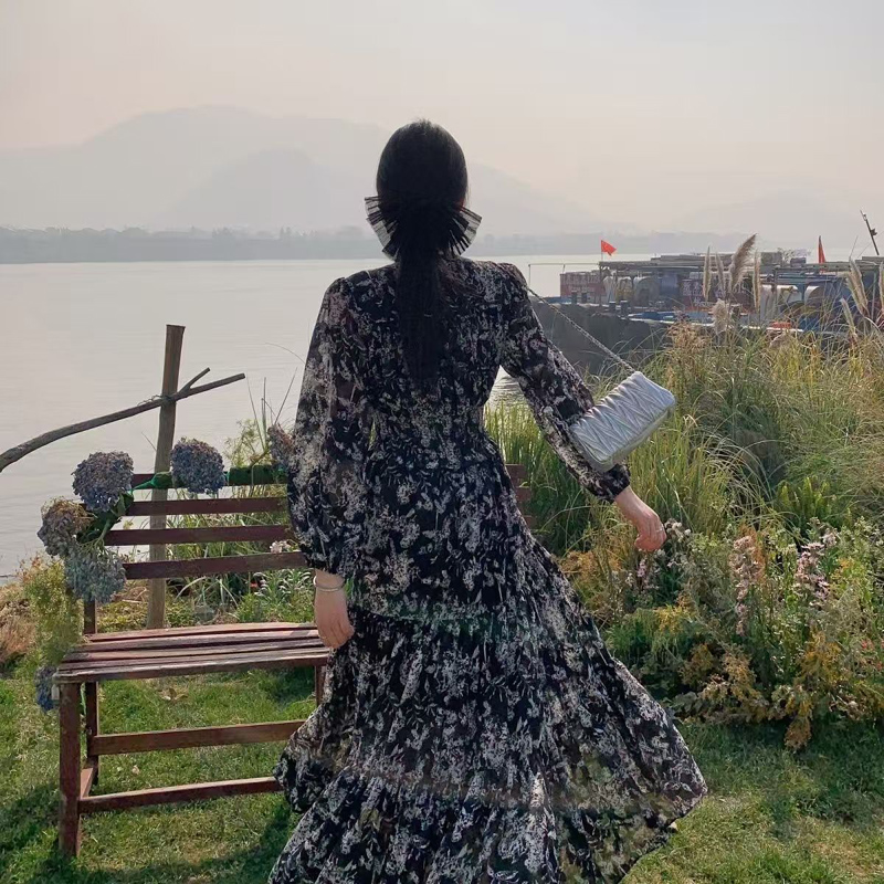 YF6005-图片色赫本风长袖V领松紧腰收腹显瘦荷叶边碎花过膝中长款雪纺长裙