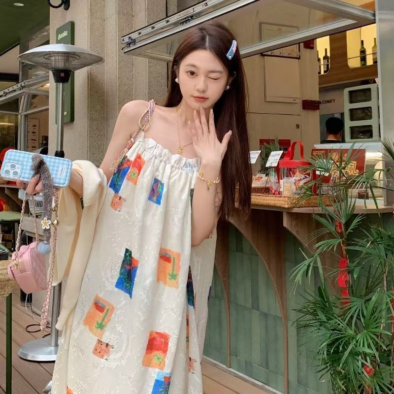 YF6009-图片色性感时尚无袖吊带A字彩格印花宽松显瘦大码海边风度假连衣裙