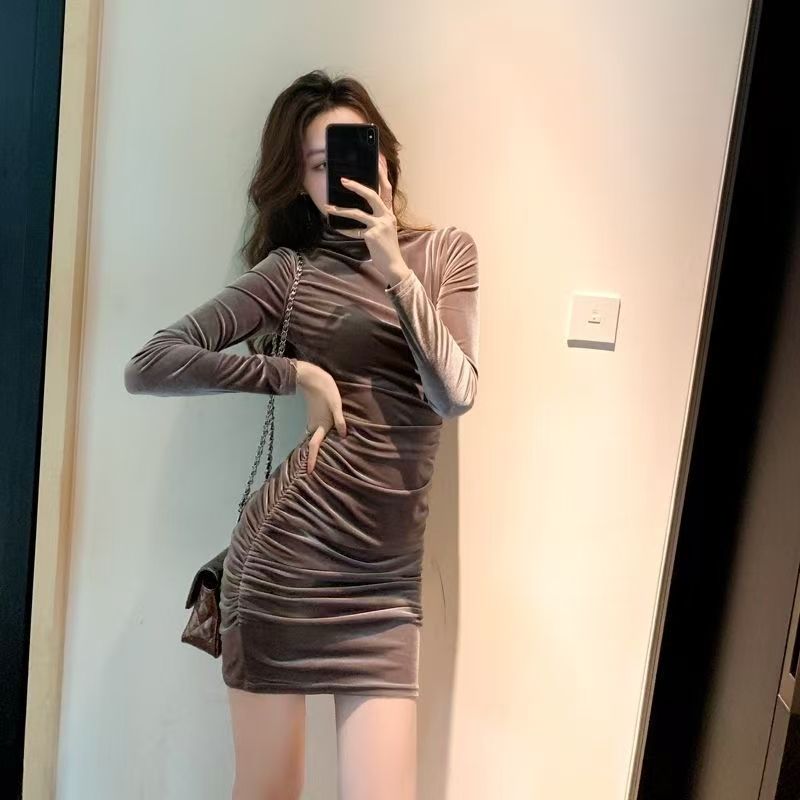 YF6019-(5色入内)秋冬名媛气质金丝绒弹力褶折收腰显瘦包臀长袖半身领连衣裙