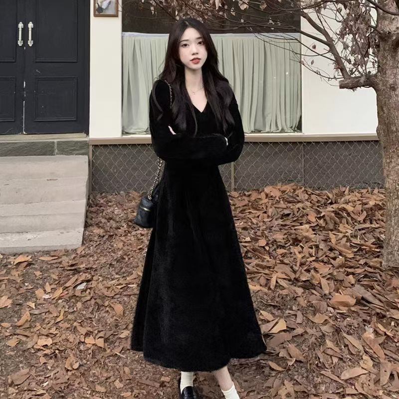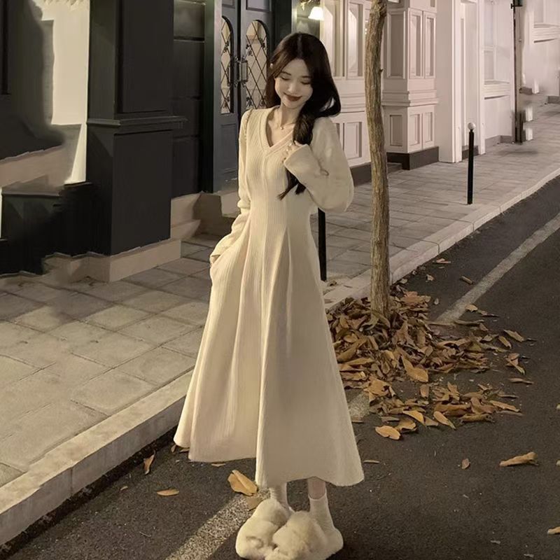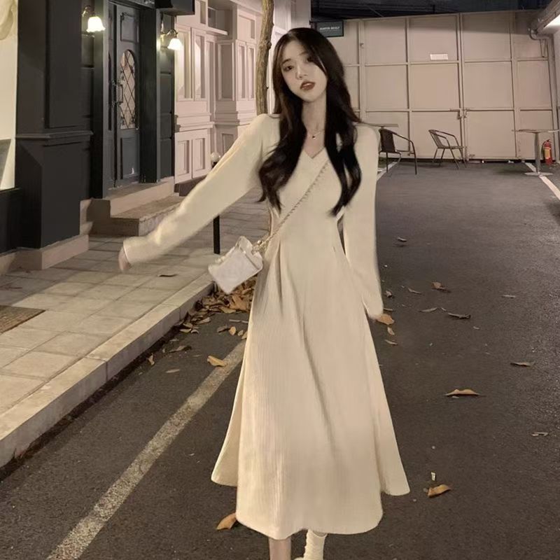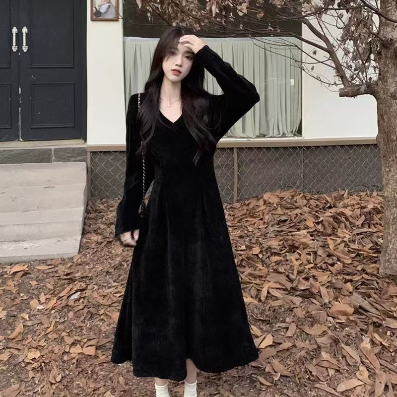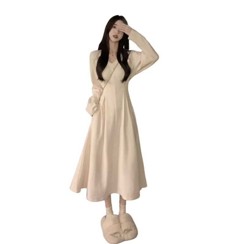 YF6023-(2色入内)赫本风甜美时尚长袖V领褶折收腰A字过膝纯色连衣裙
