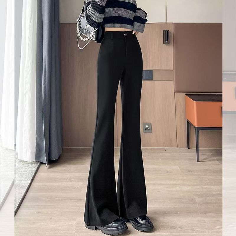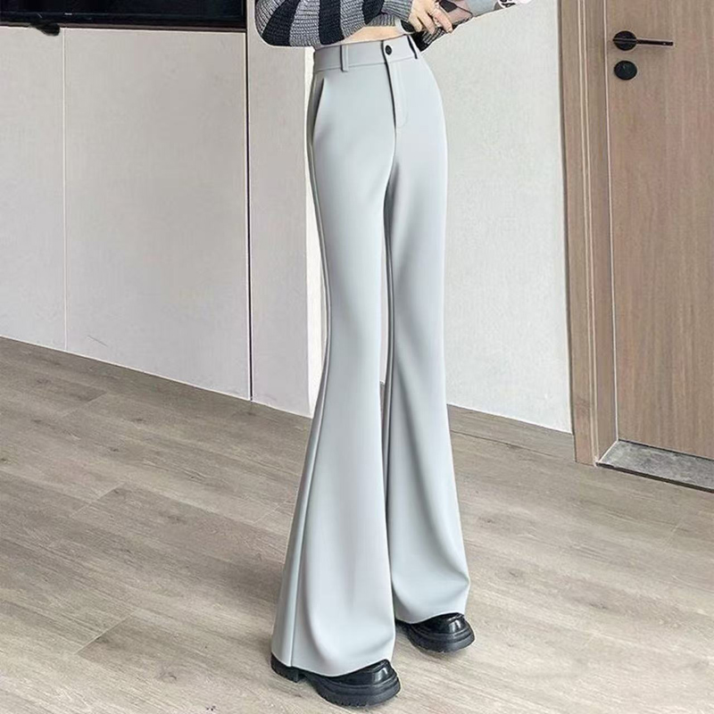 YF6031-(3色入内)时尚韩版系扣高腰微喇叭坠地感别致收腰显瘦休闲西裤