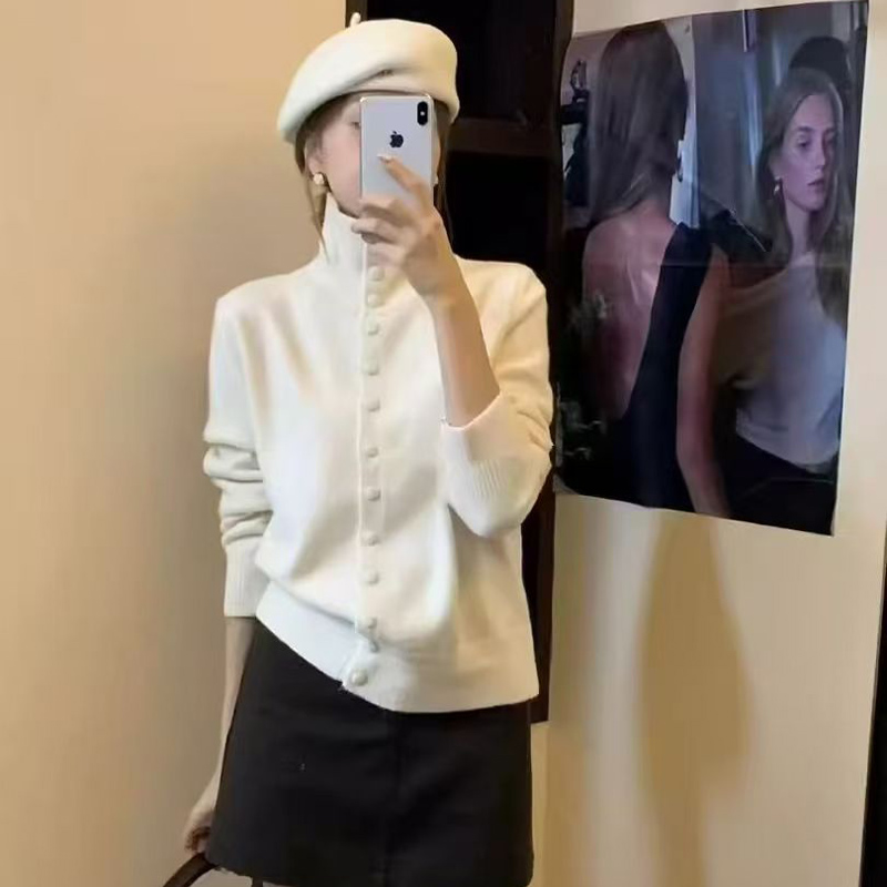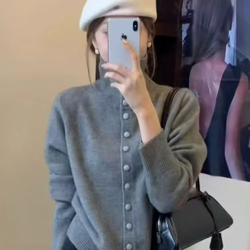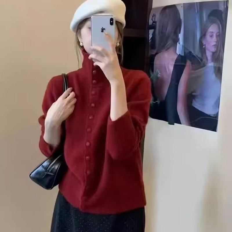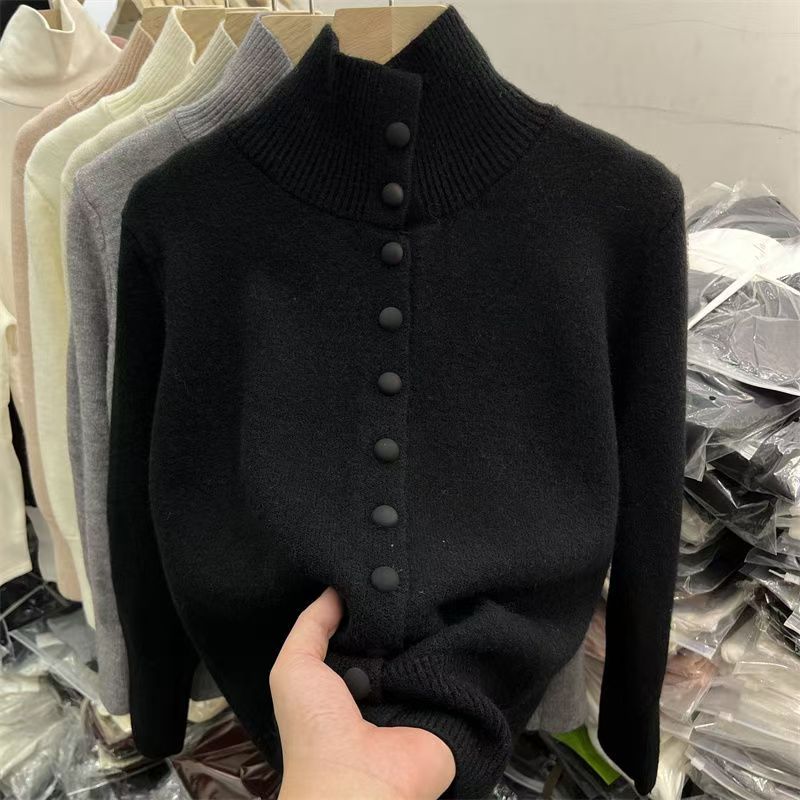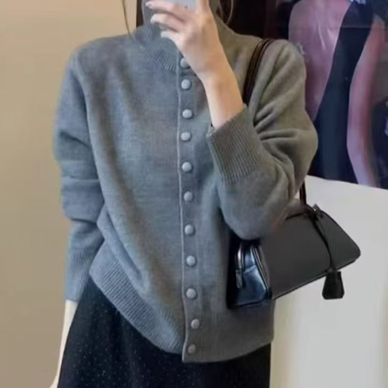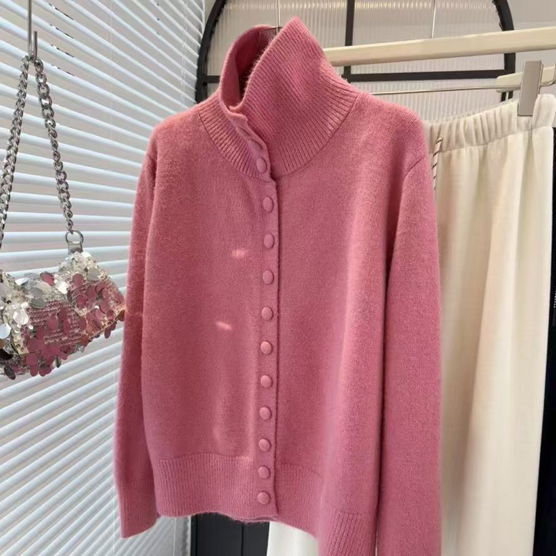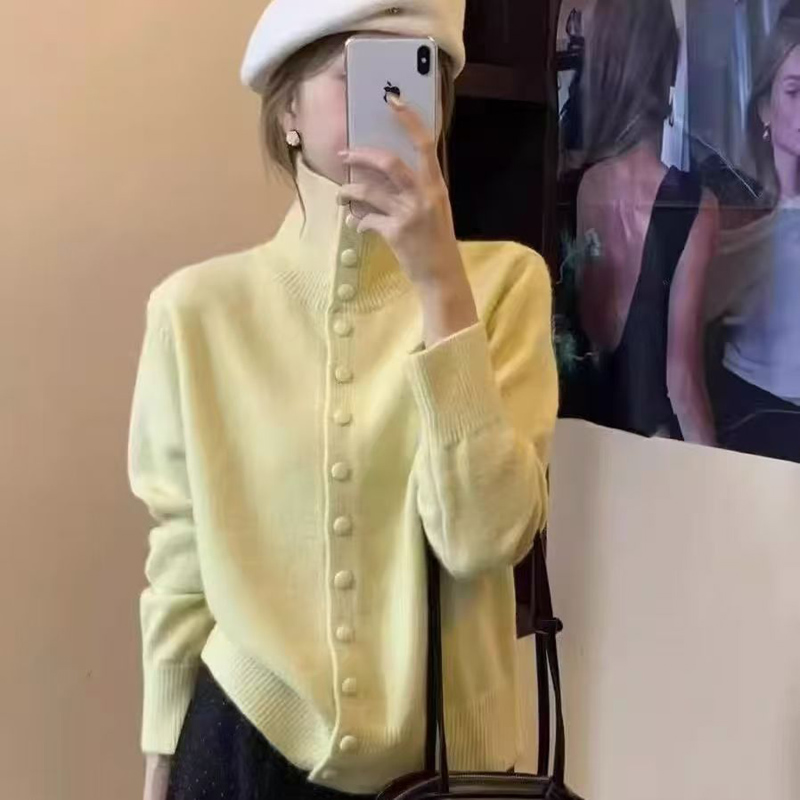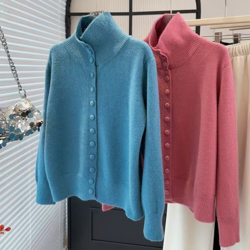 YF6032-(6色入内)甜美时尚长袖立领排扣宽松复古别致设计感包扣针织上衣