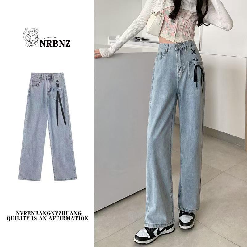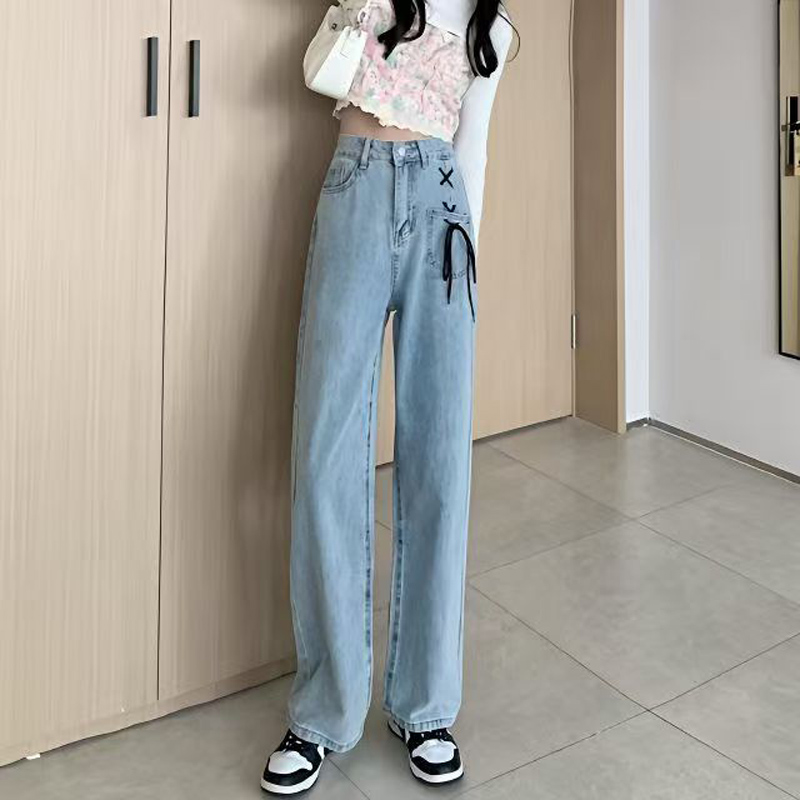 YF6035-图片色港式小心机交叉绑绳个性口袋系扣高腰直筒蓝色牛仔裤
