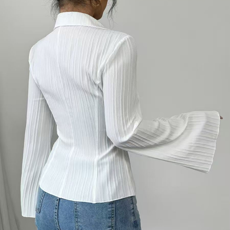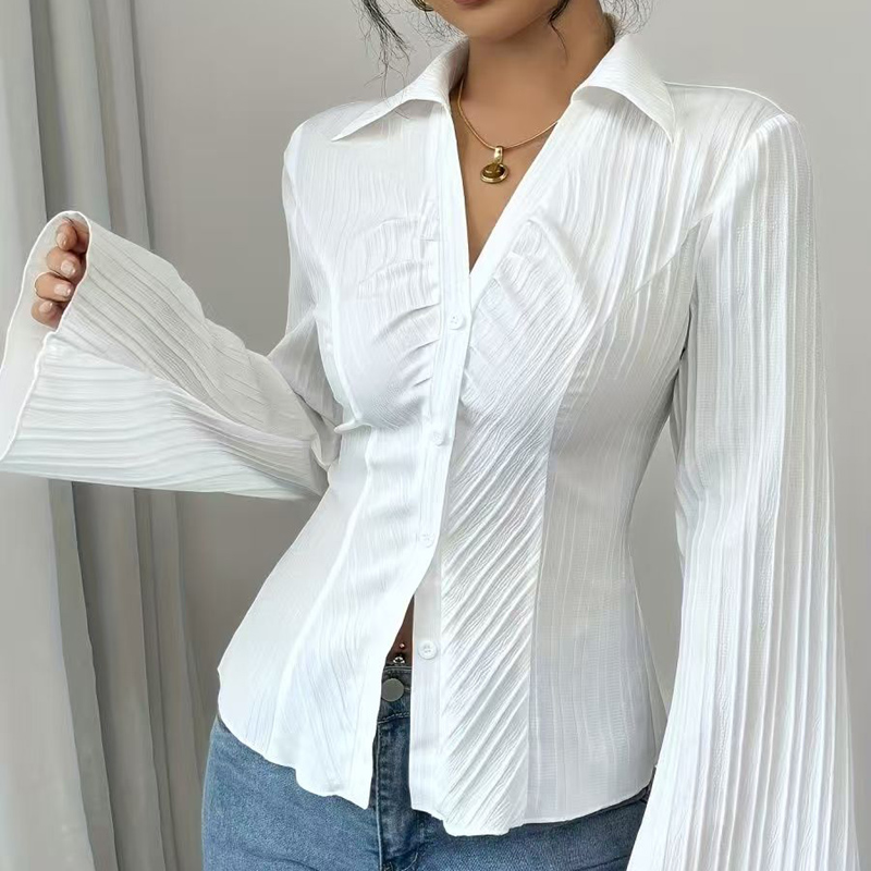 YF6037-(2色入内)性感时尚辣妹新款微喇叭翻领排扣修腰褶折设计感上衣