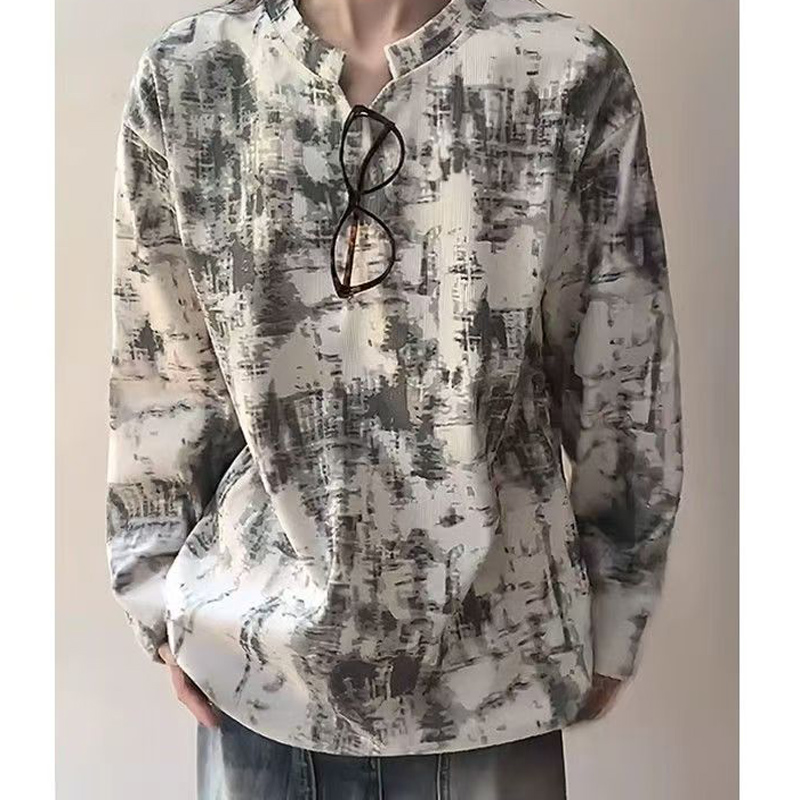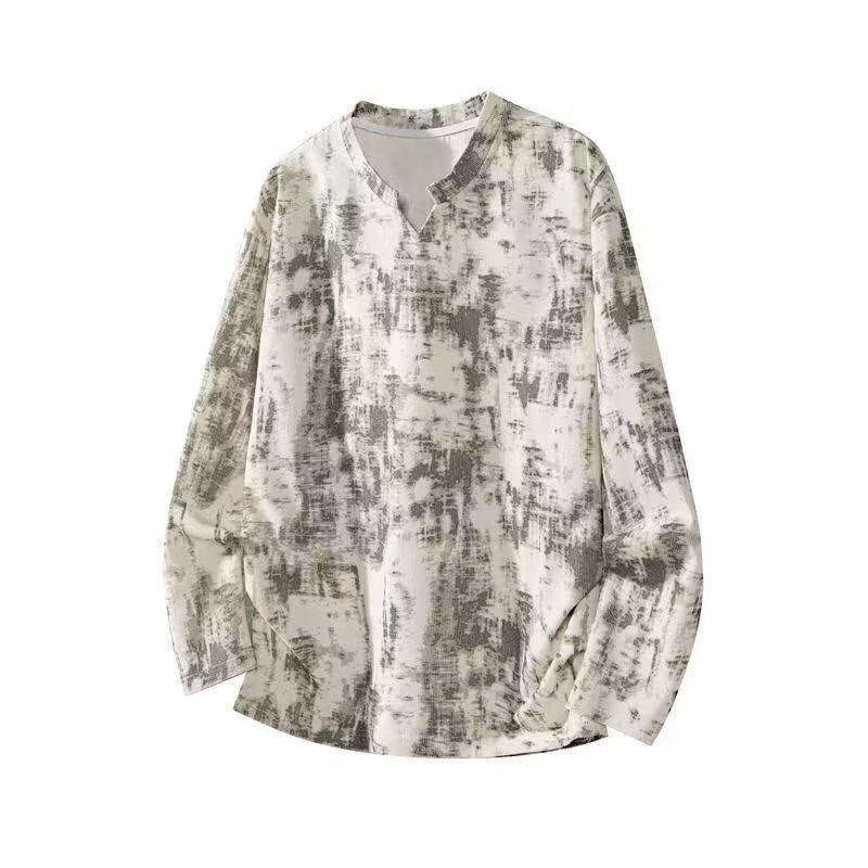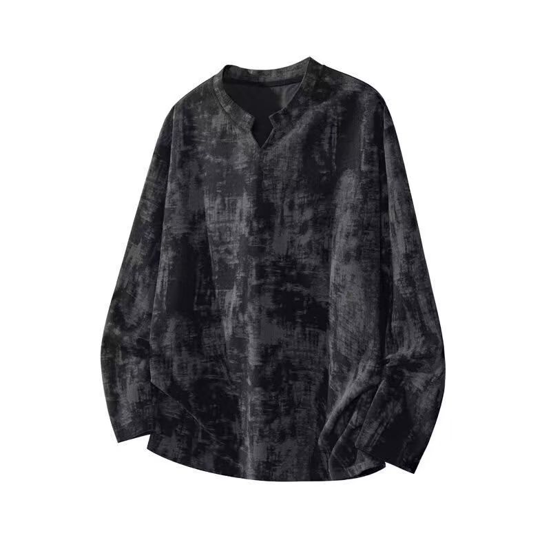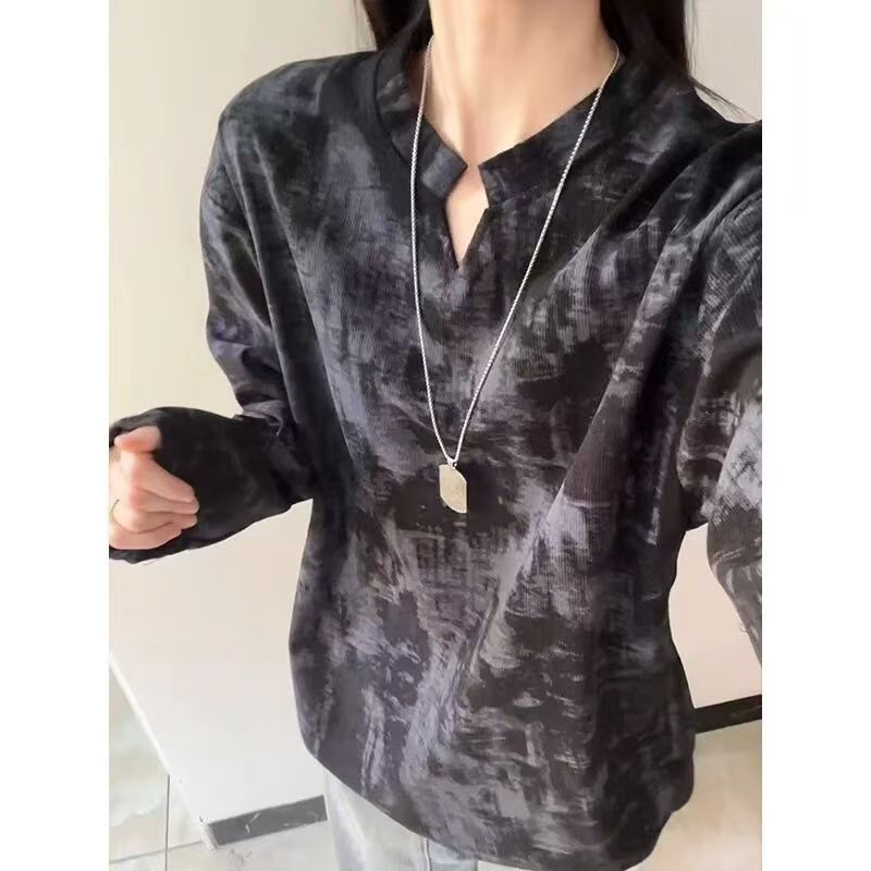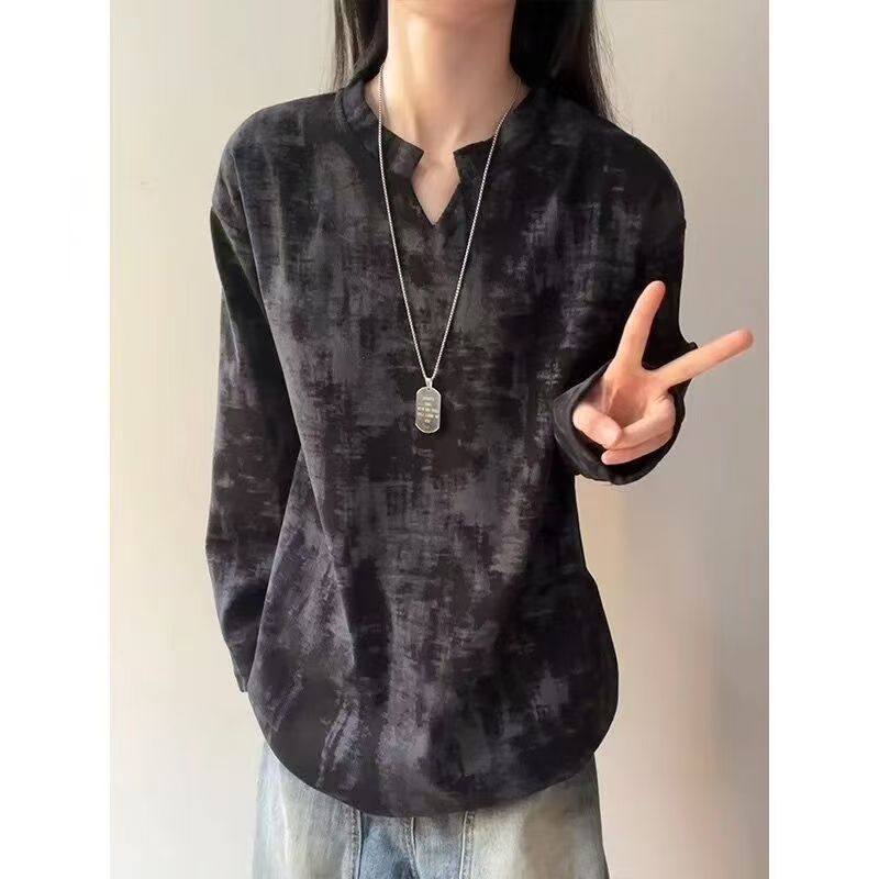 YF6039-(2色入内)复古色扎染立领V字长袖宽松大码春秋简约设计休闲T恤