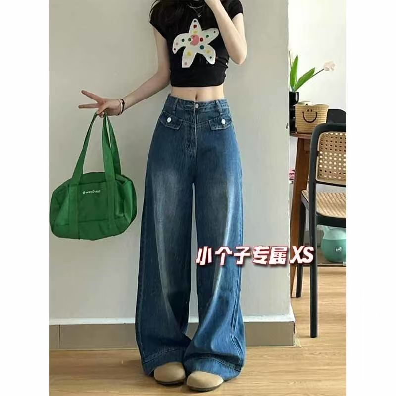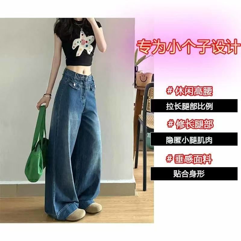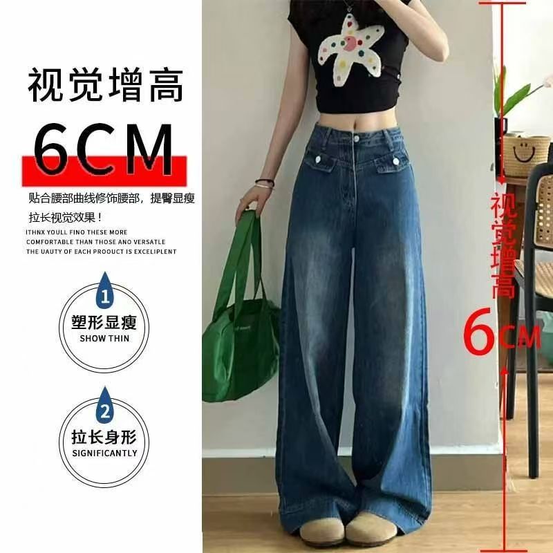 YF6041-图片色新款美式系扣高腰双口袋工装直筒坠地感洗水复古牛仔裤
