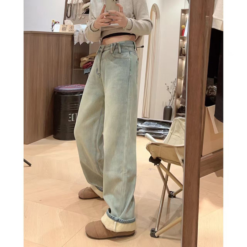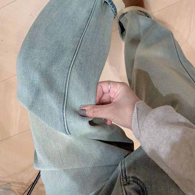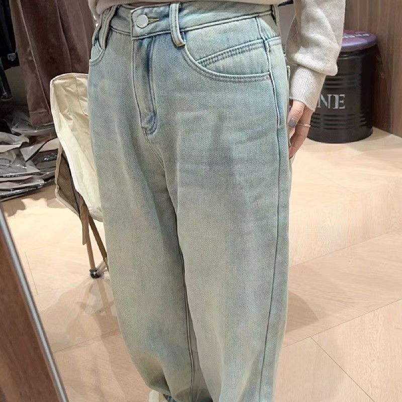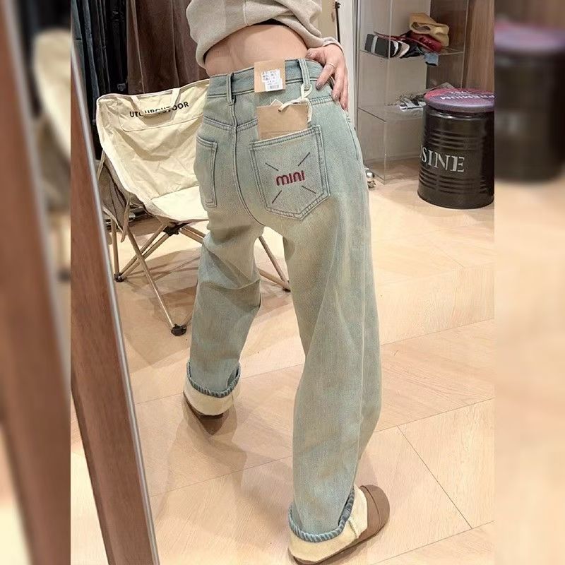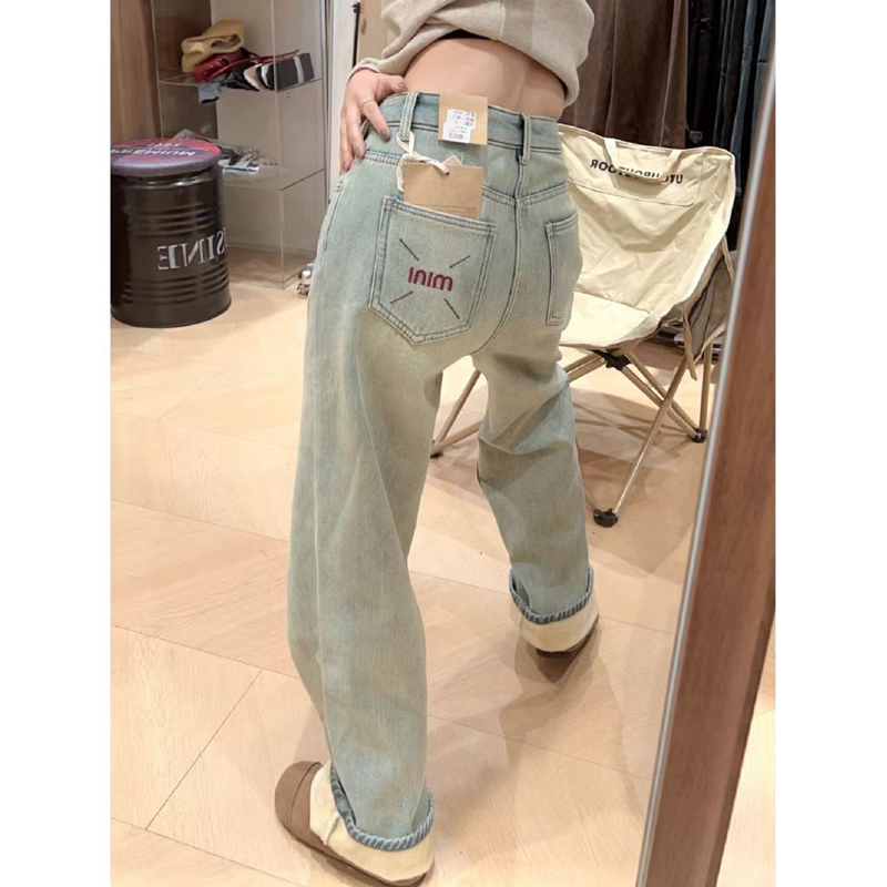 YF6050-图片色时尚个性字母刺绣口袋设计系扣高腰直筒坠地感牛仔裤