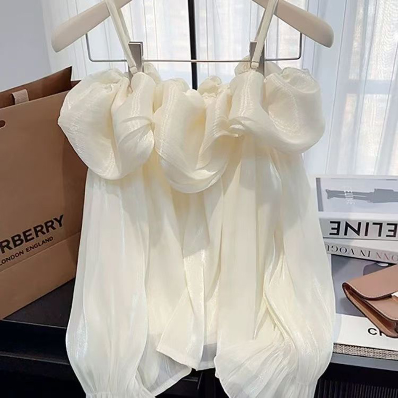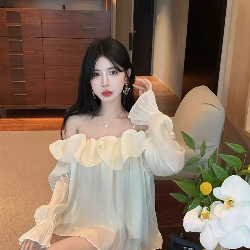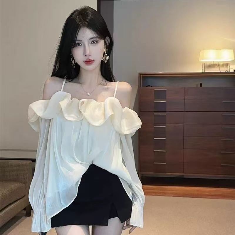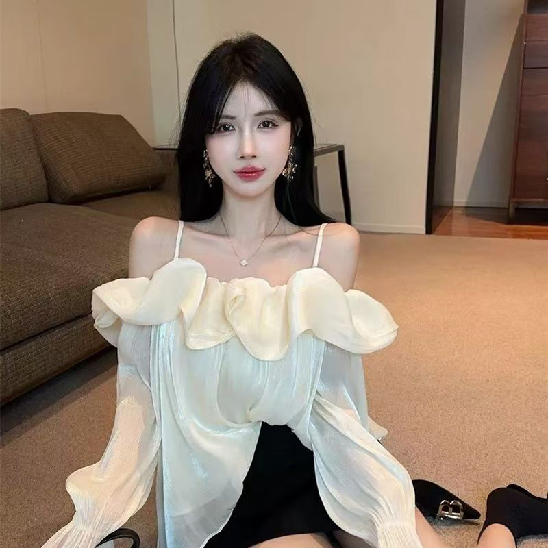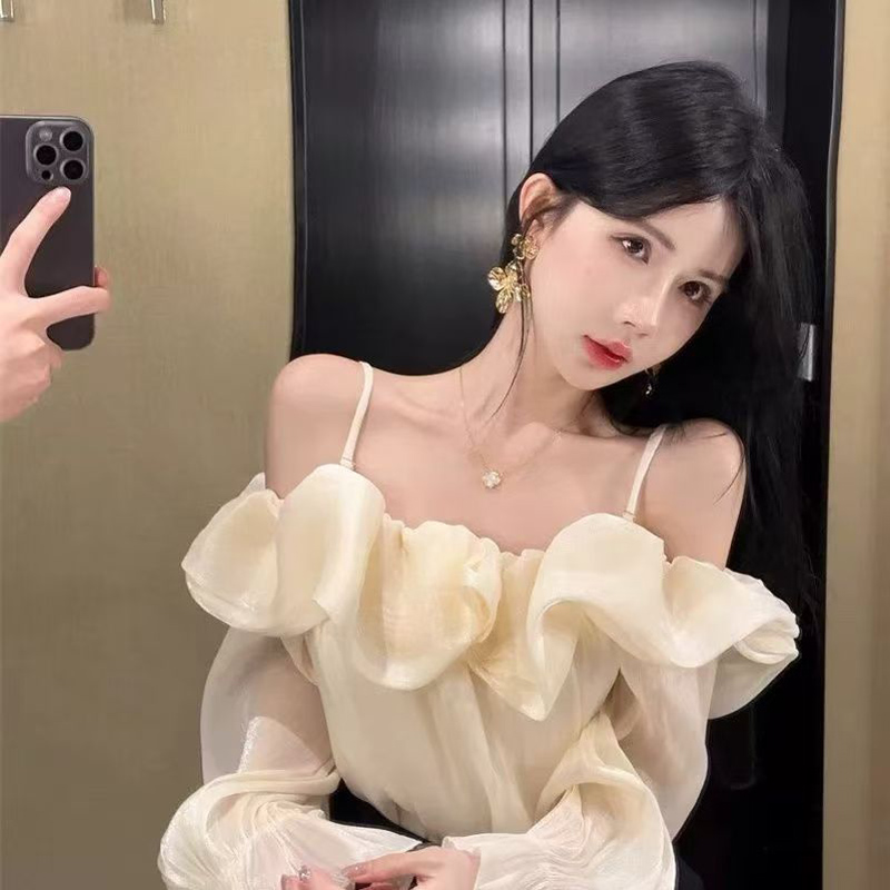 YF6052-图片色一字肩吊带荷叶边波浪纹设计感长袖露肩宽松性感上衣