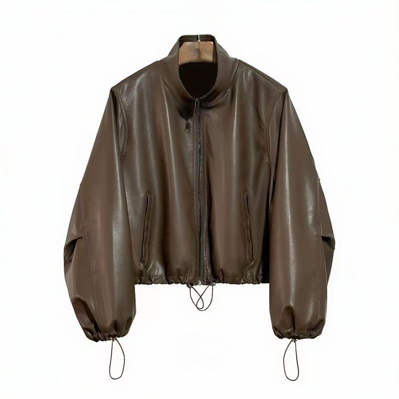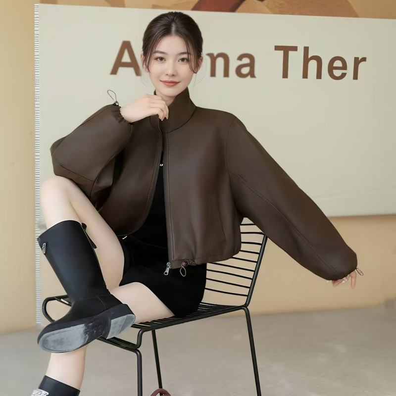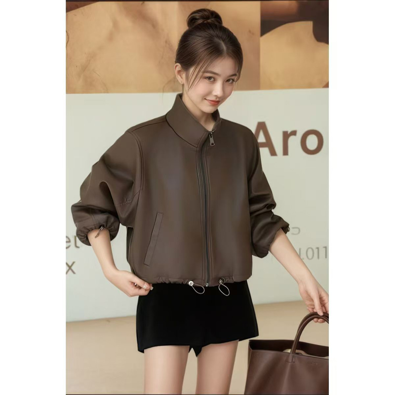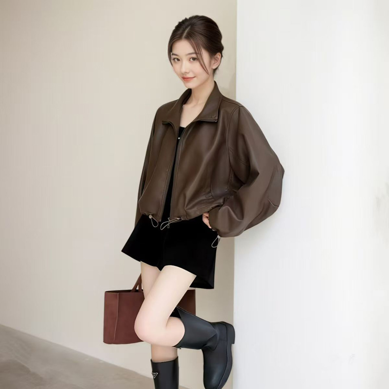 YF6055-图片色港风冬季长袖立领拉链抽绳修身大码显瘦仿皮草机车夹克外套