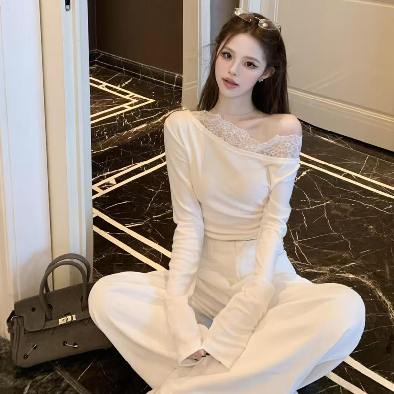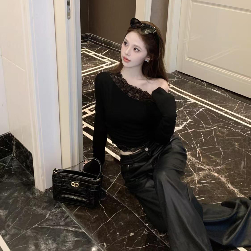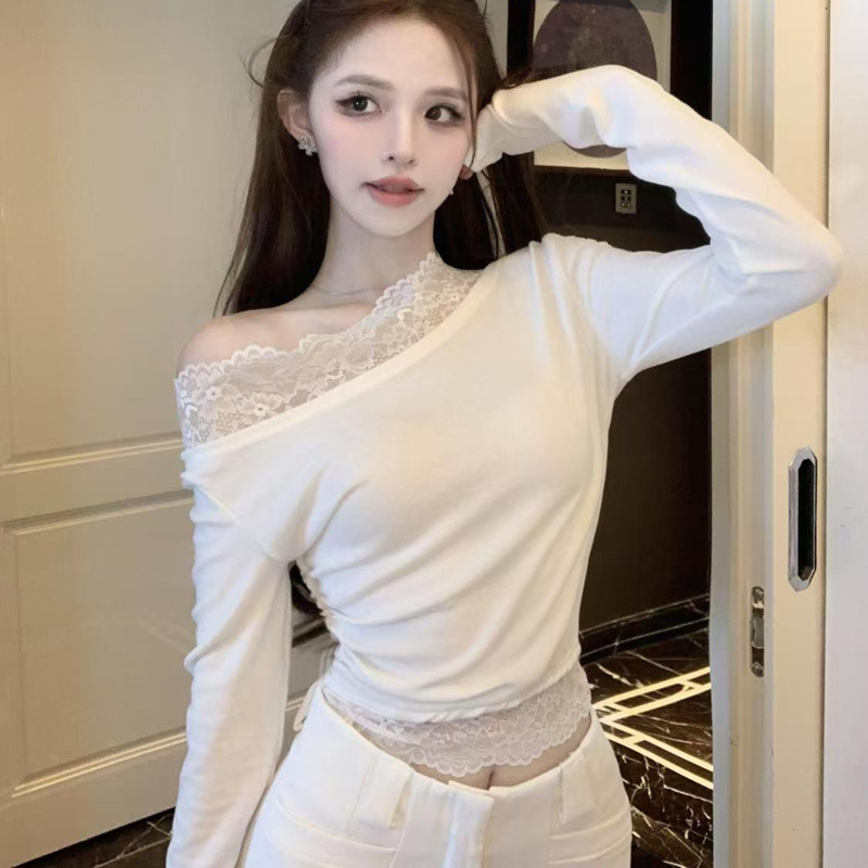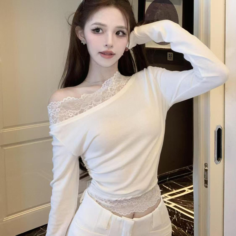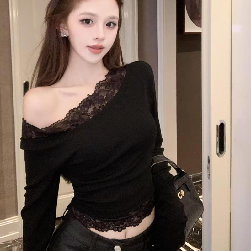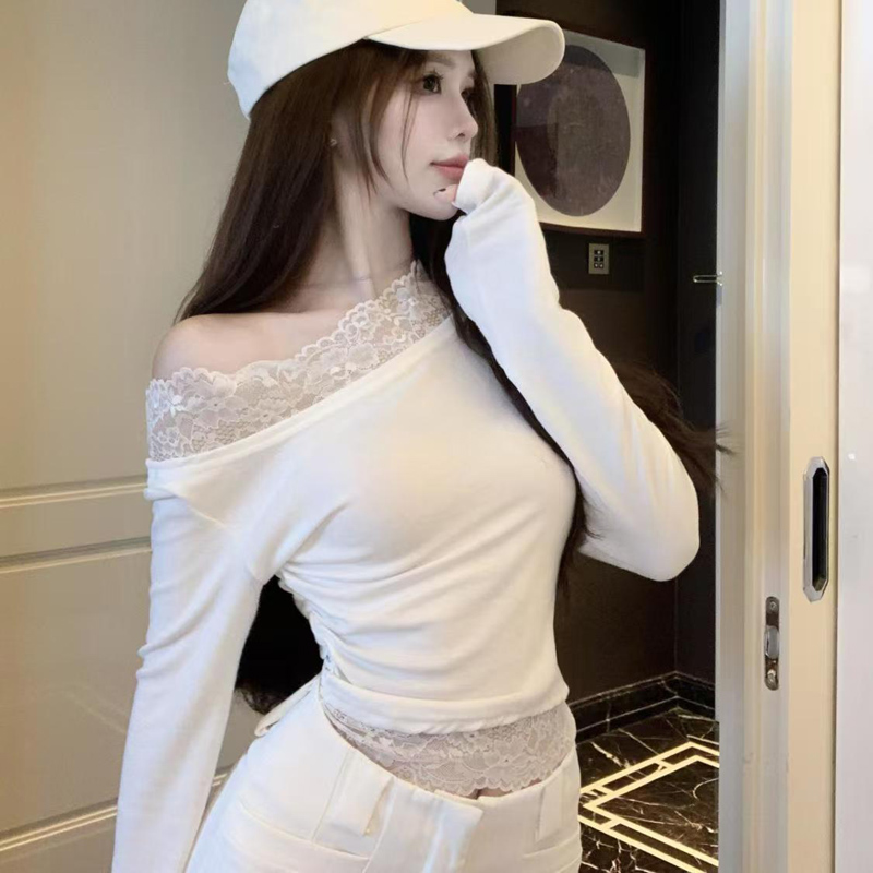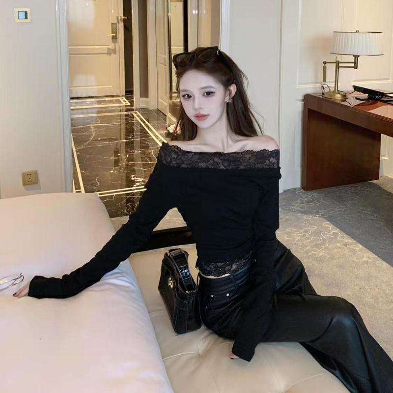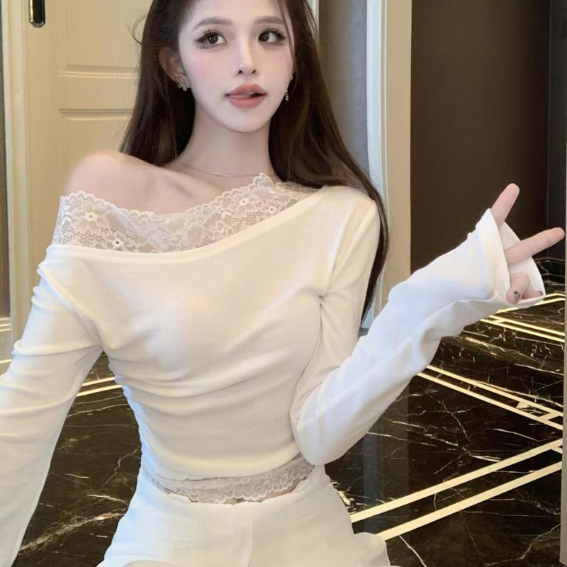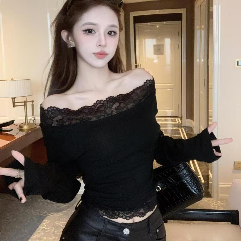 YF6056-(2色入内)甜美别致蕾丝拼接一字肩弹力修身露脐短款打底百搭上衣