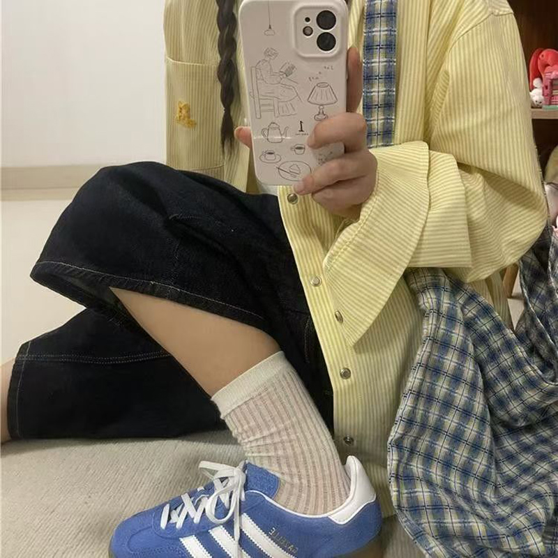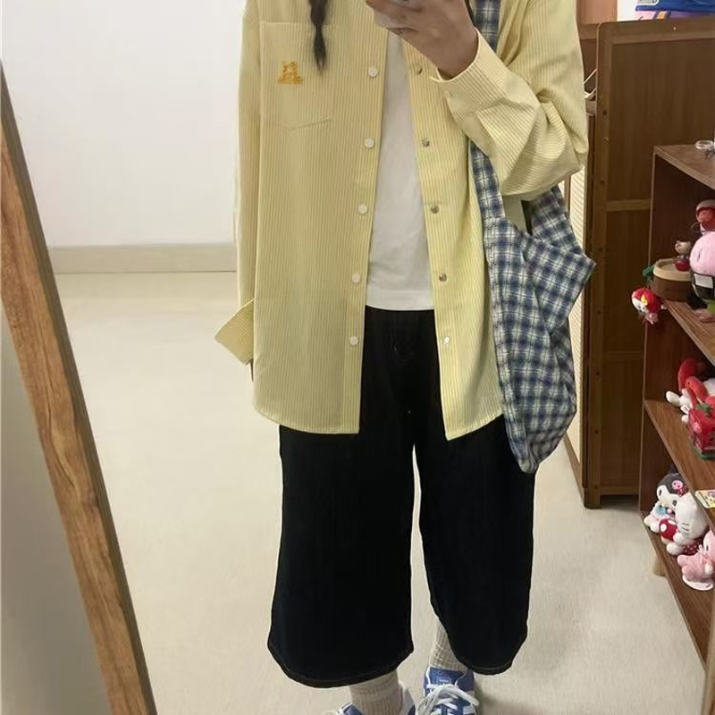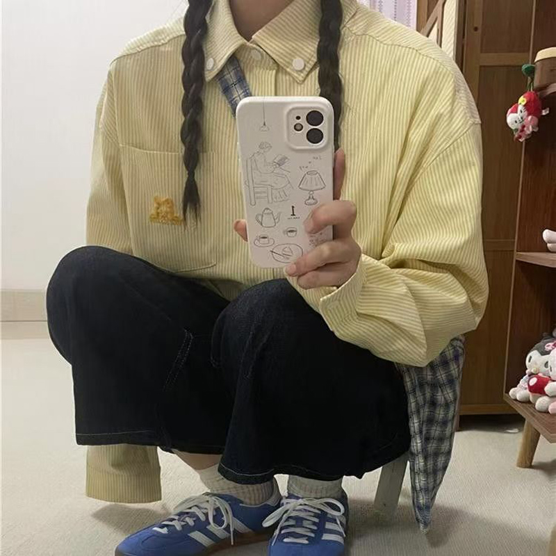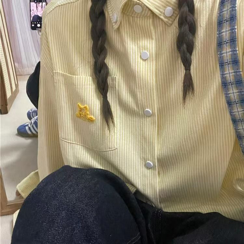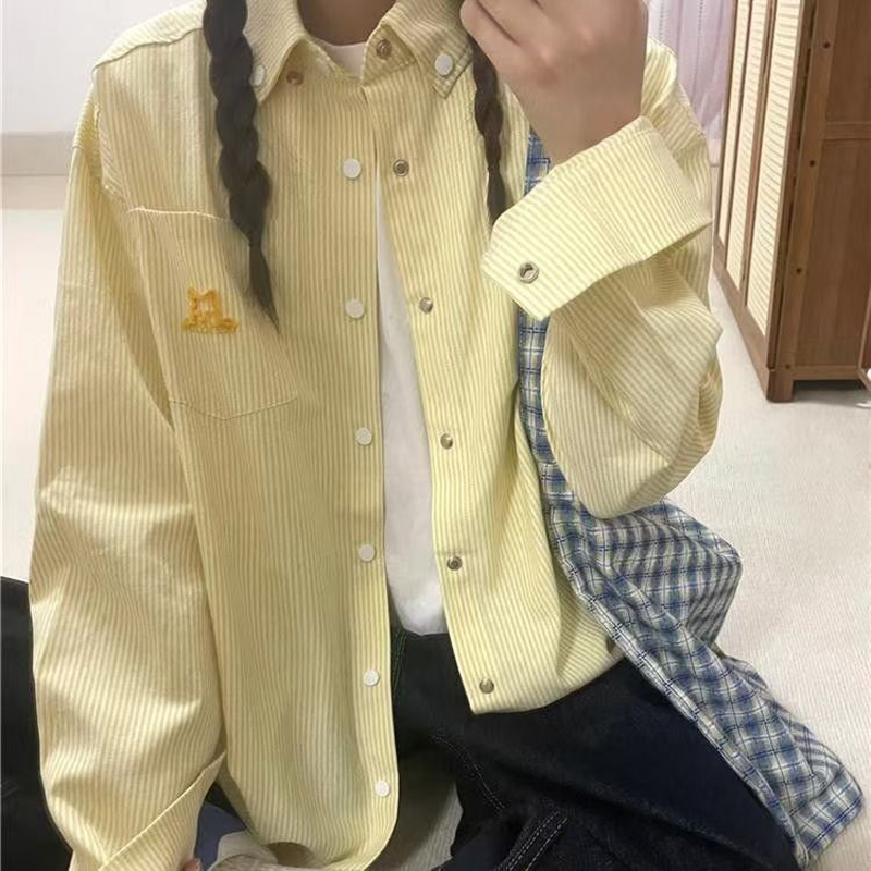 YF6059-图片色休闲港式卡通刺绣黄色条纹长袖翻领宽松大码衬衫上衣