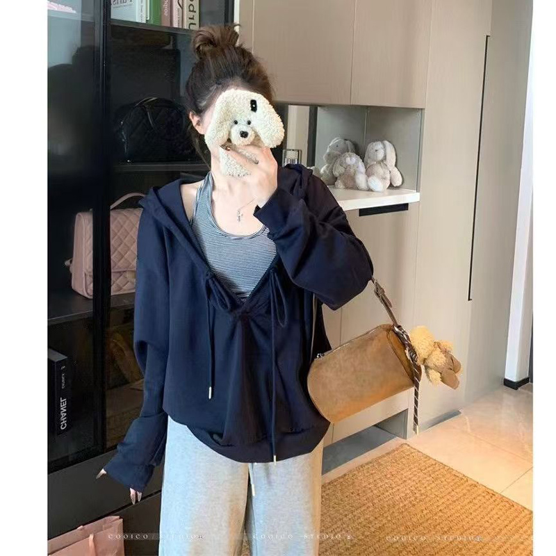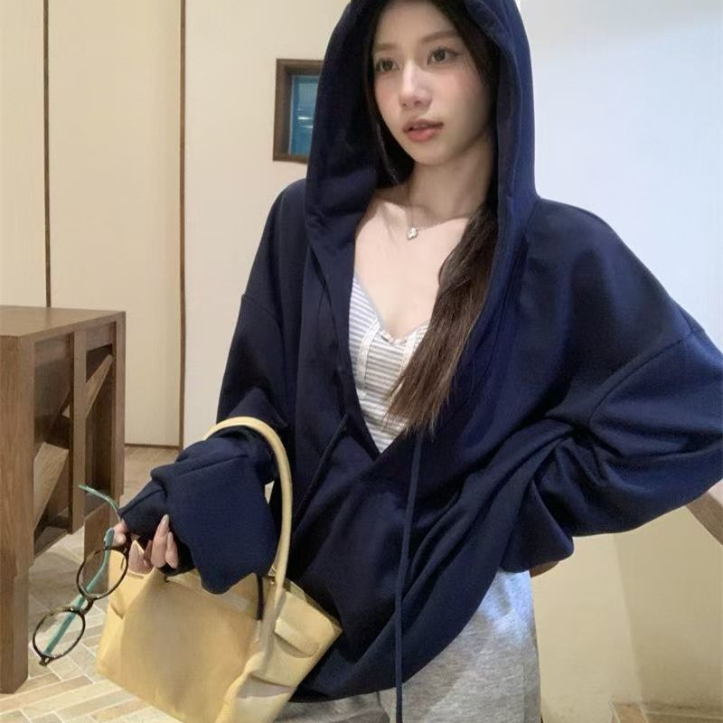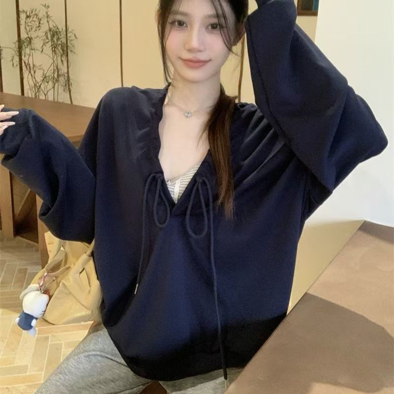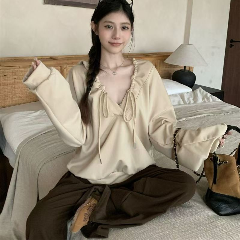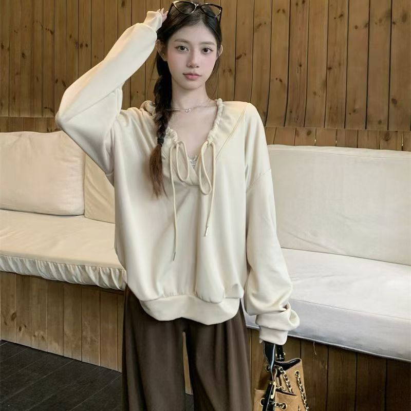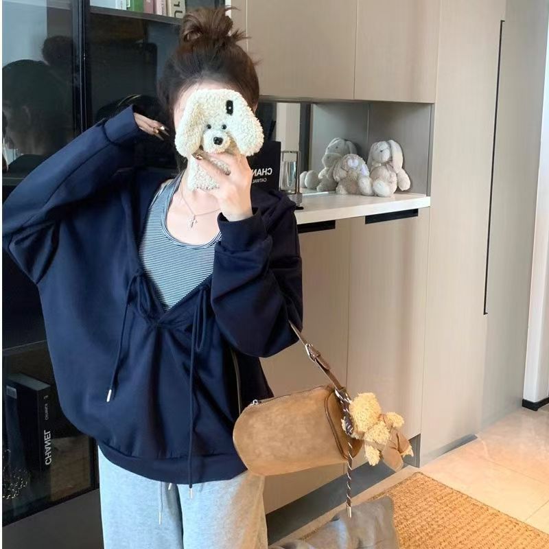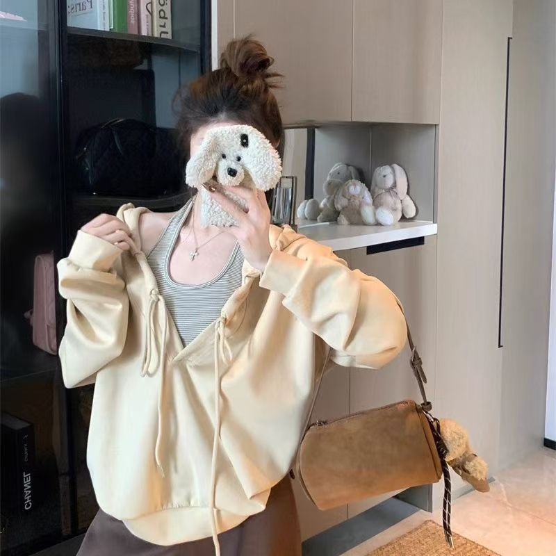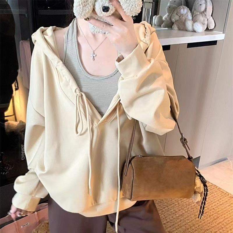 YF6060-(2色入内)港式抽绳连帽长袖宽松大码慵懒风设计感休闲卫衣潮