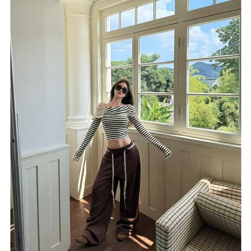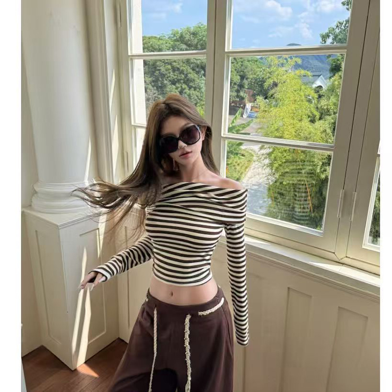 YF6061-图片色一字肩小辣椒露肩长袖复古条纹弹力修身小众设计感上衣