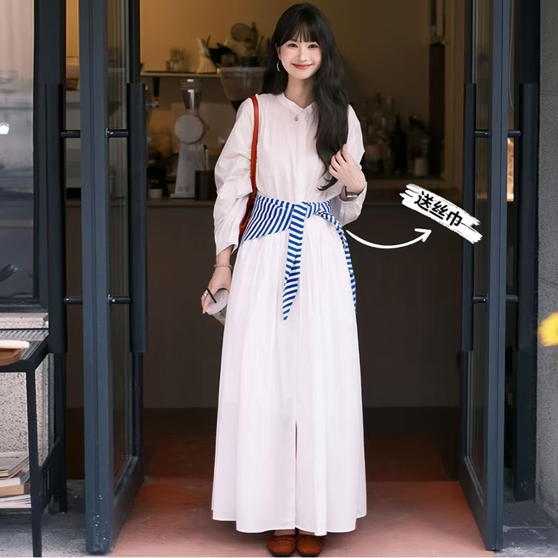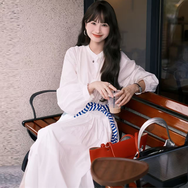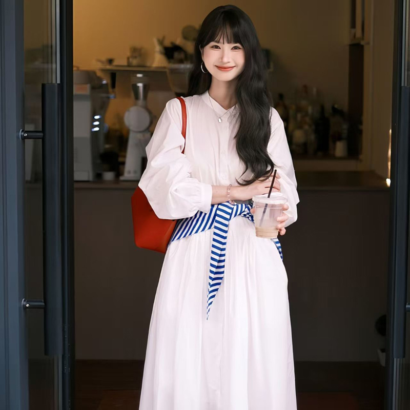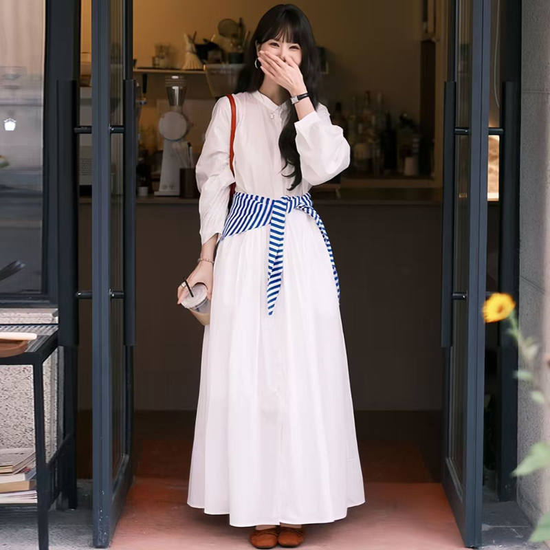 YF6064-图片色甜美小清新长袖立领系扣系腰带白色别致高级感大码连衣裙