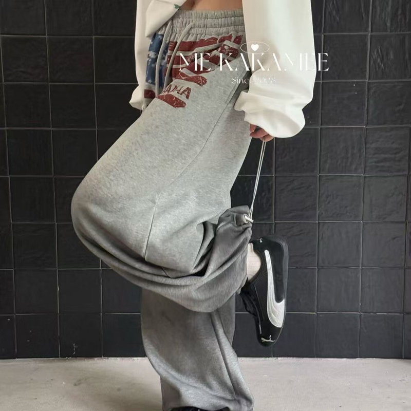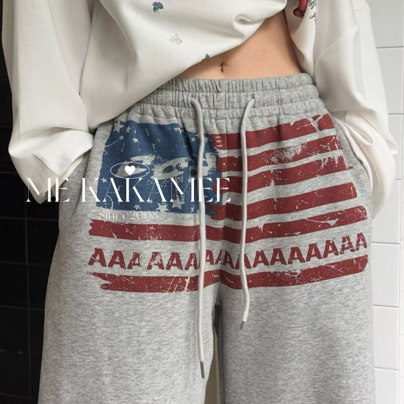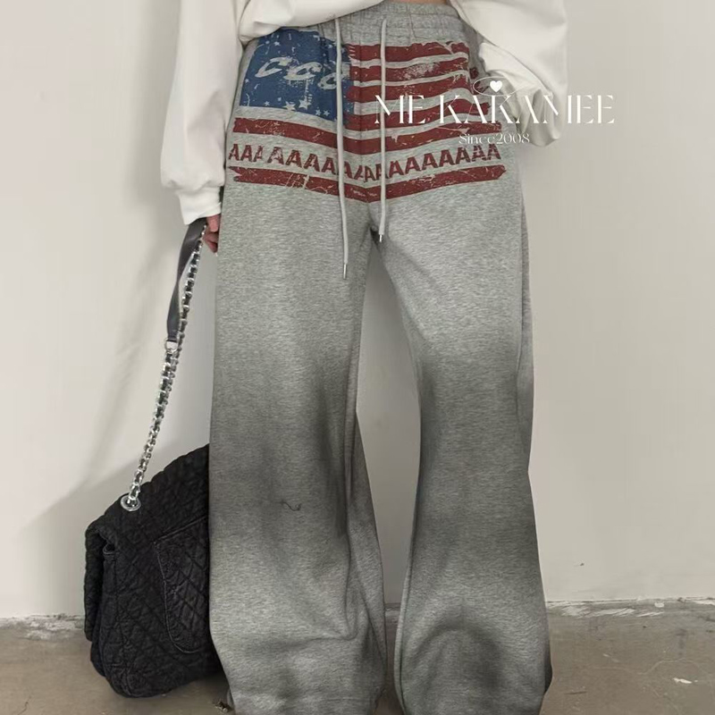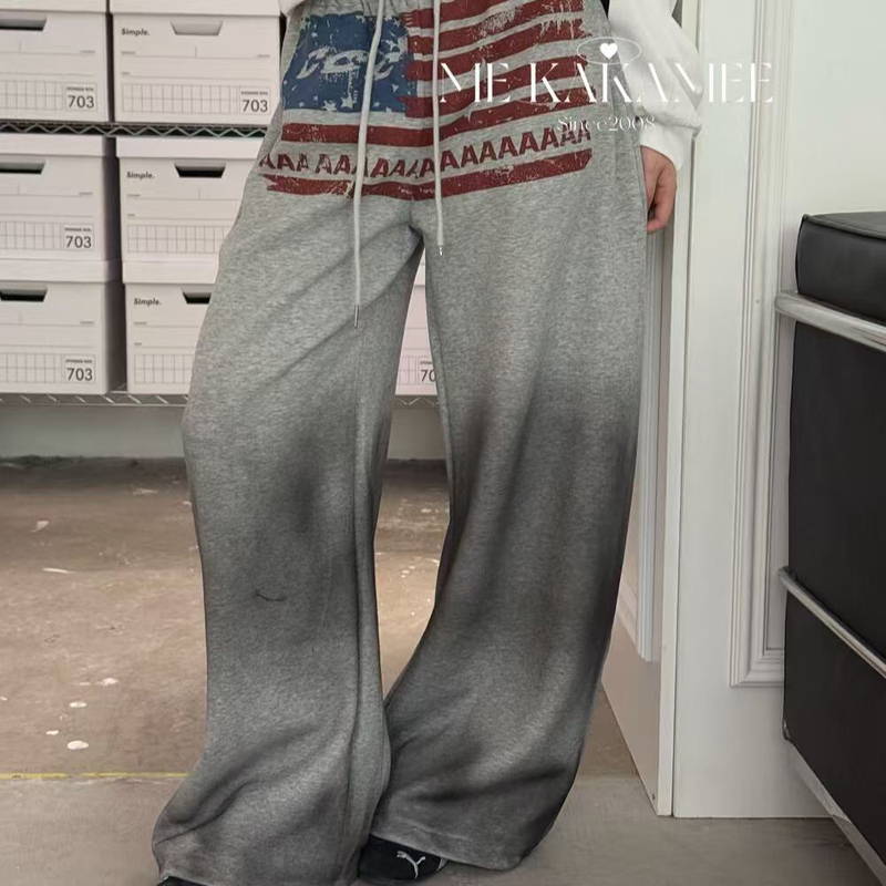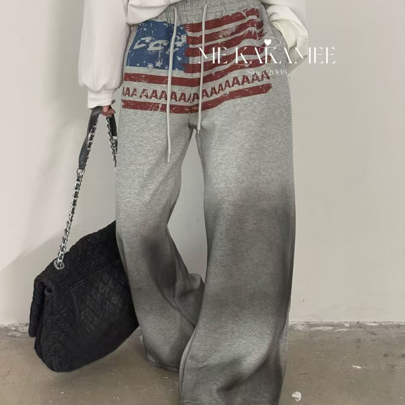 YF6067-图片色港式新款松紧腰绑绳直筒字母印花做旧洗水坠地感卫衣裤