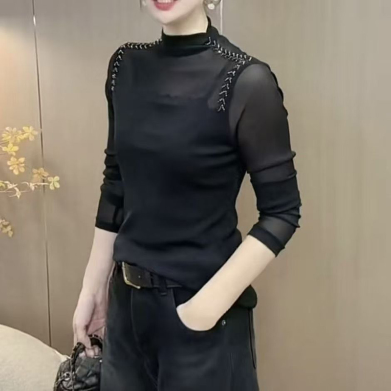 YF6071-图片色韩版时尚网纱编织拼接透视圆领弹力紧身高级感蕾丝上衣
