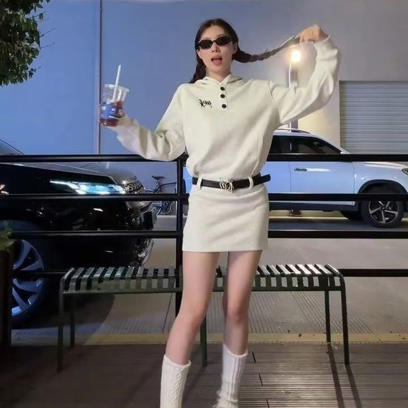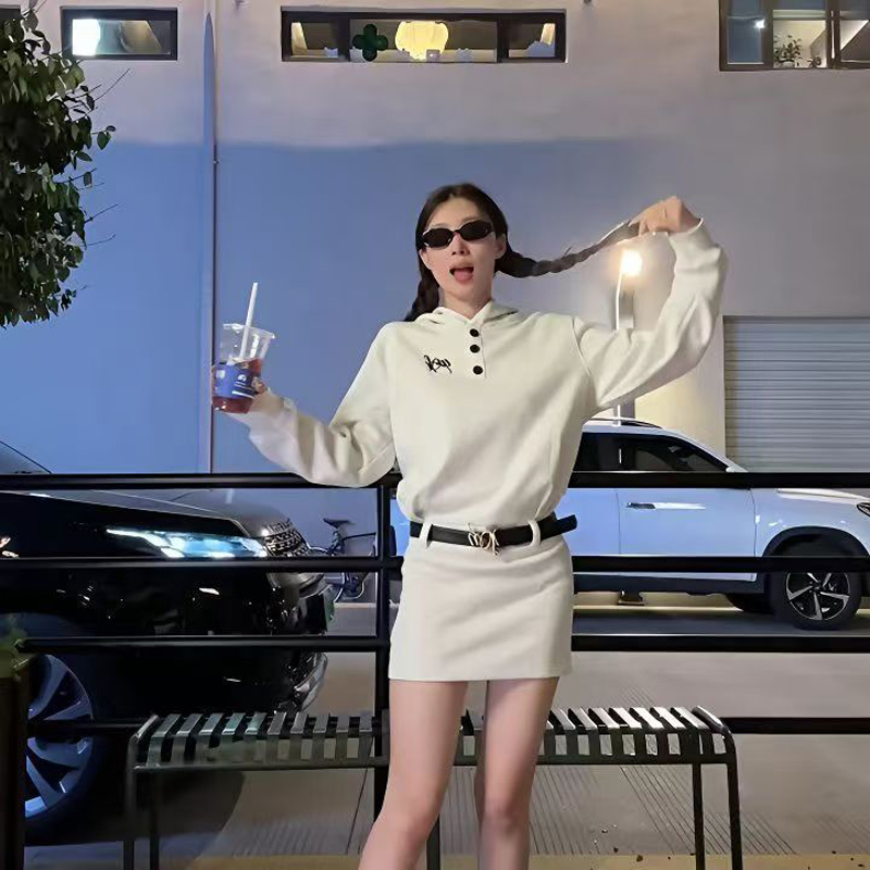 YF6072-图片色小可爱字母印花长袖连帽系扣包臀宽松休闲运动卫衣裙
