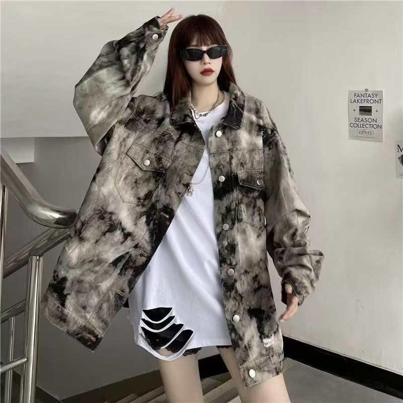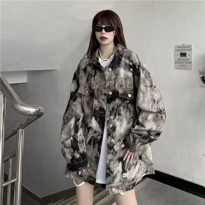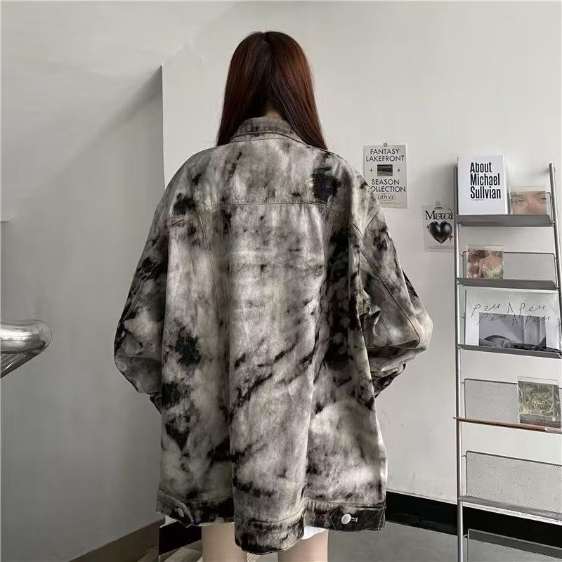 YF6075-图片色复古扎染洗水做旧小众设计慵懒风长袖POLO领大码牛仔上衣