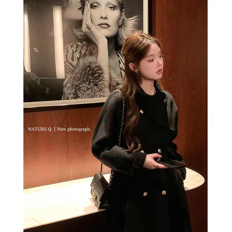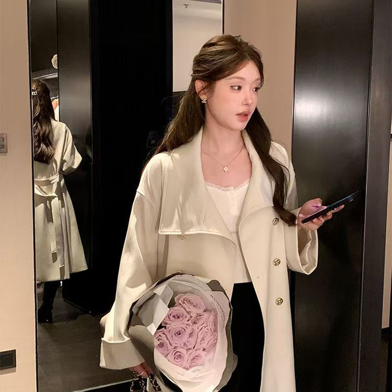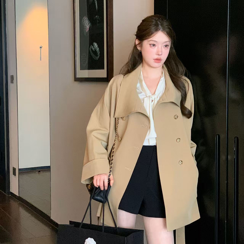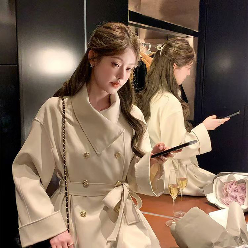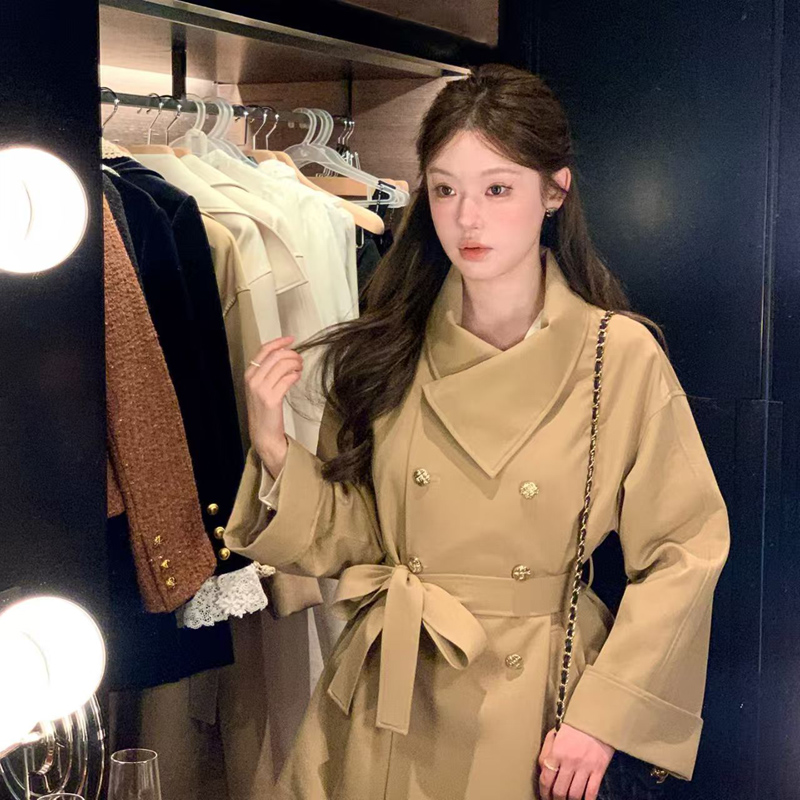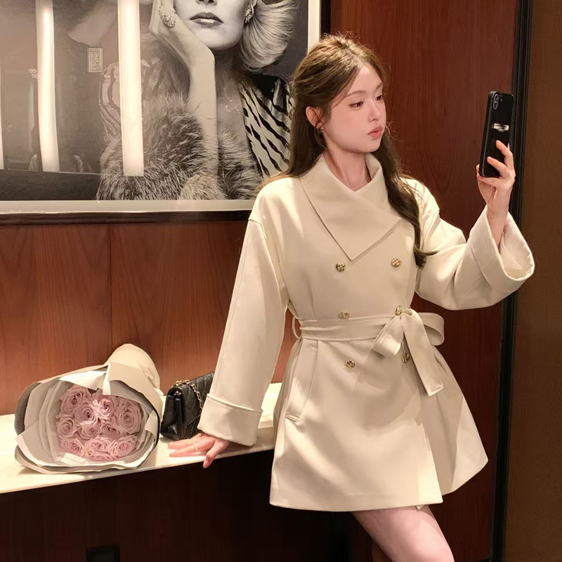 YF6080-(4色入内)秋冬短款长袖翻领系腰带双排扣英伦风大码显瘦知性风衣潮衣