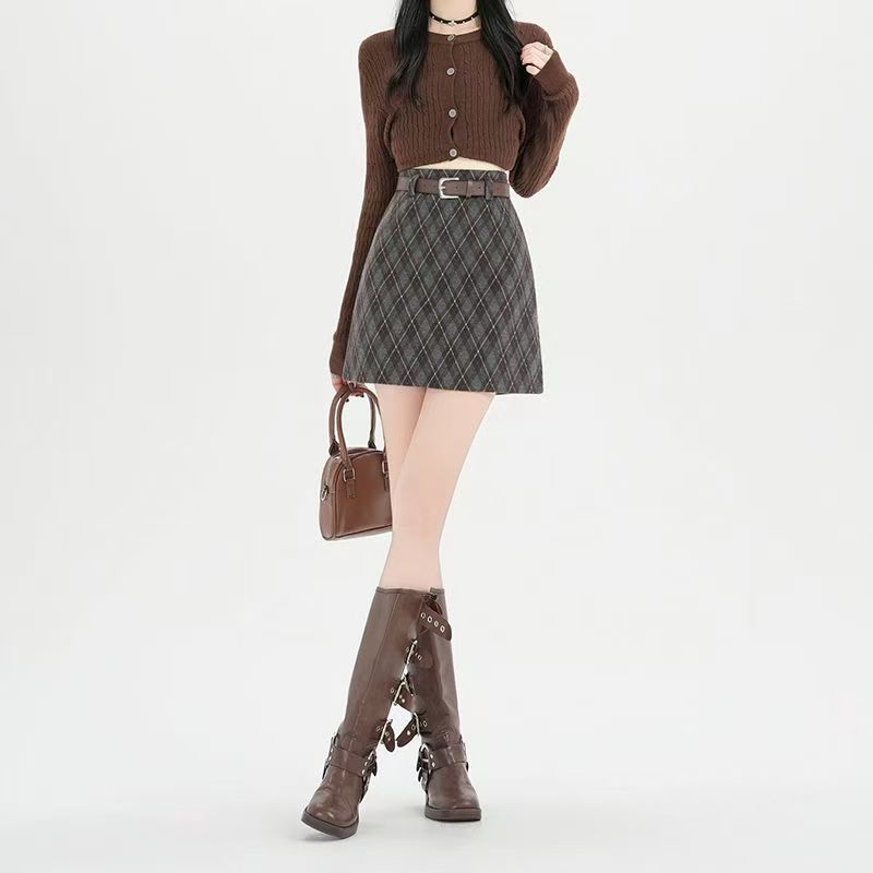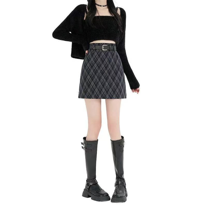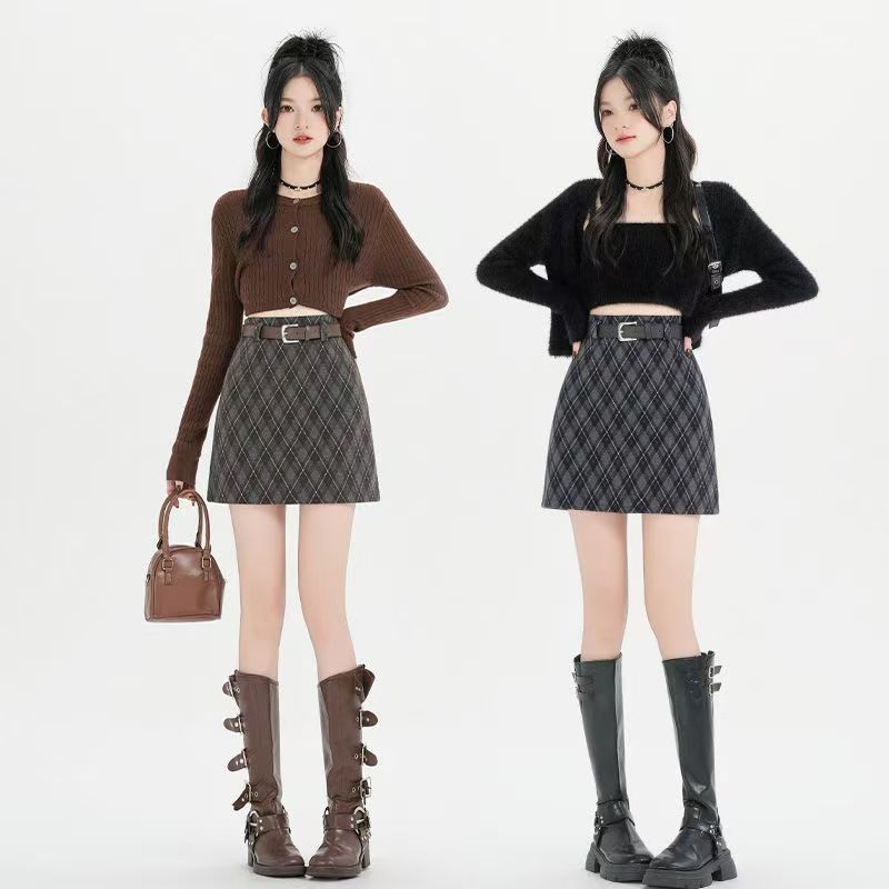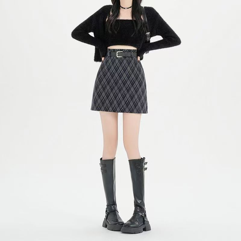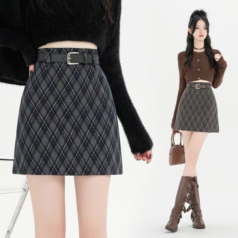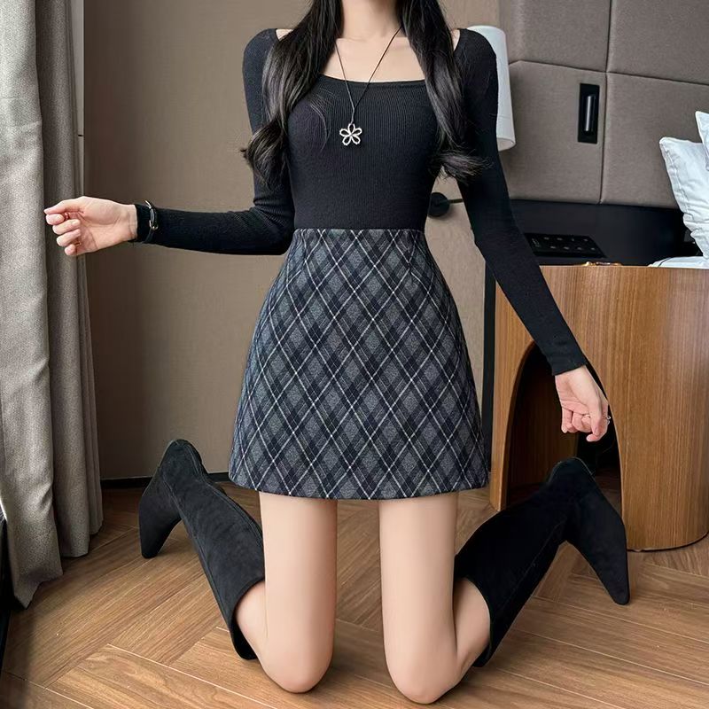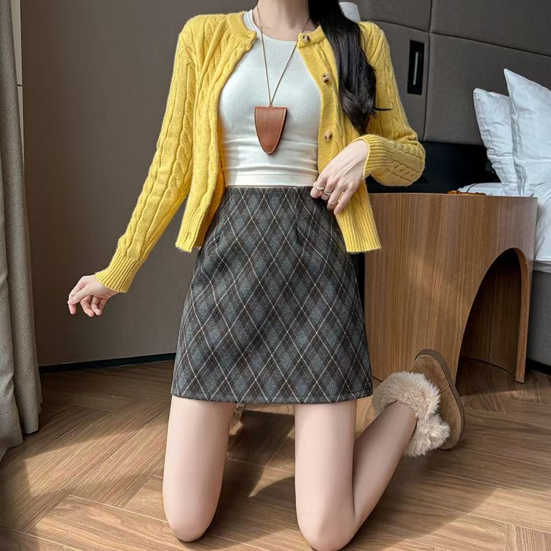 YF6081-(3色入内)秋冬毛呢新款高腰A字菱形提花编织显高防走光内衬半身裙